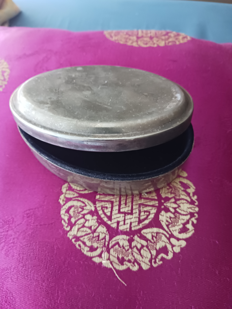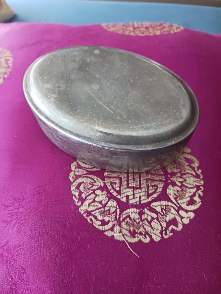 Selling a vintage silver trinket box. It has signs of wear, but that just shows its age. (1980) The inside is lined with blue felt. This beautiful palm sized piece can hold jewelry, coins, earrings or anything your heart desires. It is time it holds your treasures!