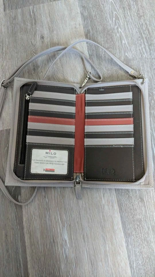 This is a brand new Milo genuine leather wallet purse it's designed to protect items which use RFID tech. Lots of areas for cards a zipper pouch of money pouch a phone pouch and an outside zipper pouch. Asking cash only pick up in Edmonton only.
