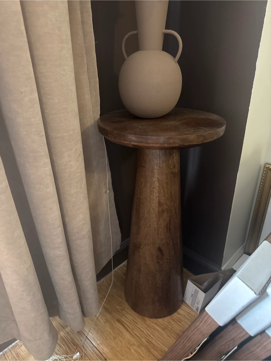 Selling a wooden accent table. It features a round top and a pedestal base. The wood has a warm, brown tone, and the table would be a great addition to any room!