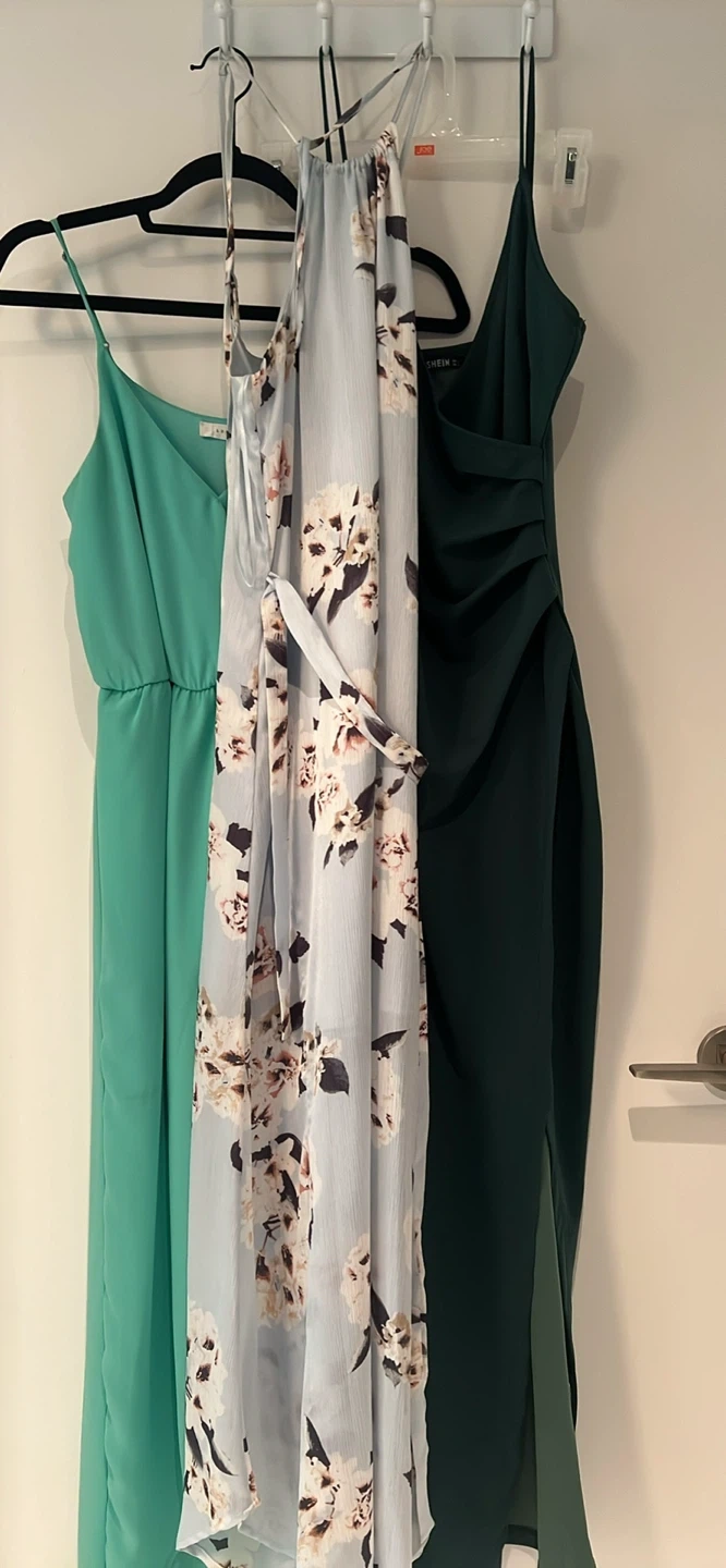 92Floral blue dress - xsmall but can fit a small - $30 Turquoise green - size small - $25 Green SHEIN dress - size small - $15 All 3 dresses for $60