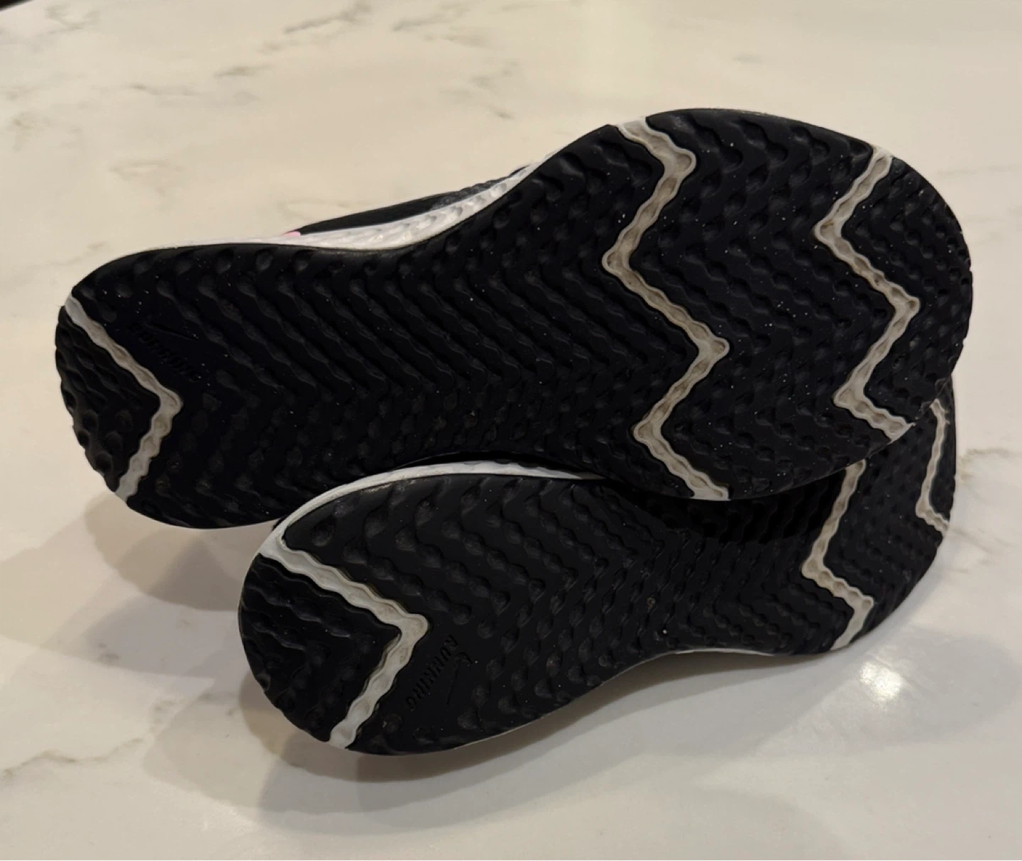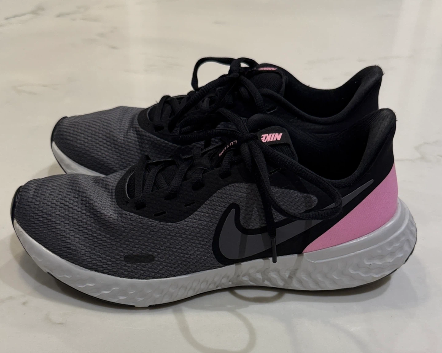Selling a pair of Nike Revolution women's running shoes. They are a stylish grey and black with a pop of pink on the heel. Great for running or everyday wear!