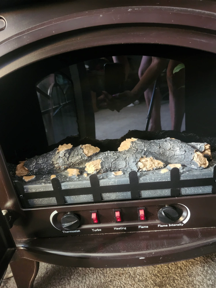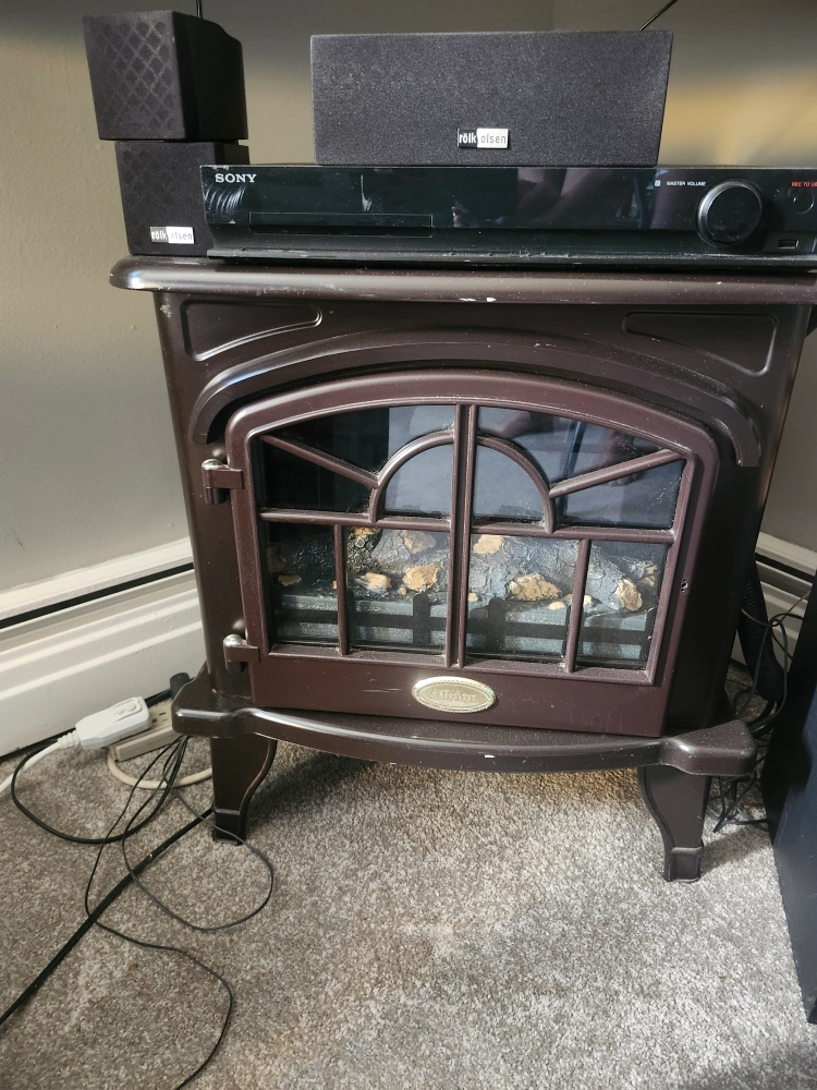 Selling an antique electric fireplace heater. It's in good condition and provides a cozy ambiance. Features include a thermostat, turbo setting, heating control, and flame intensity adjustment. Perfect for adding warmth and charm to any room!