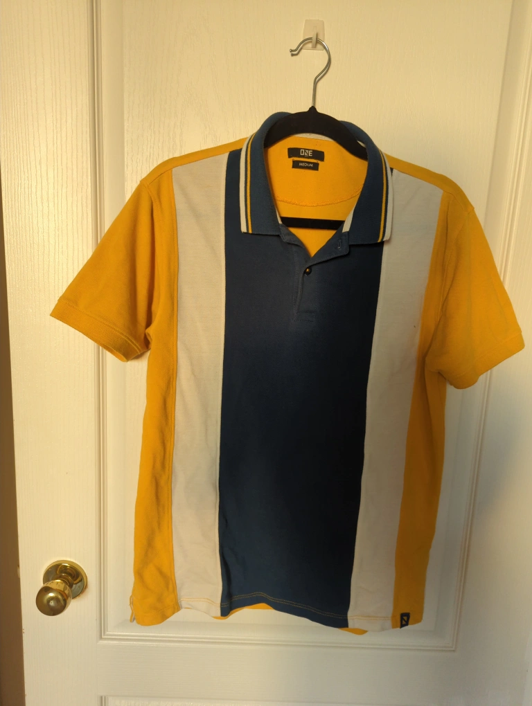 Selling a ONE Life polo shirt in size medium! It features a unique colour block design with yellow, white, and navy. Great for a casual look!