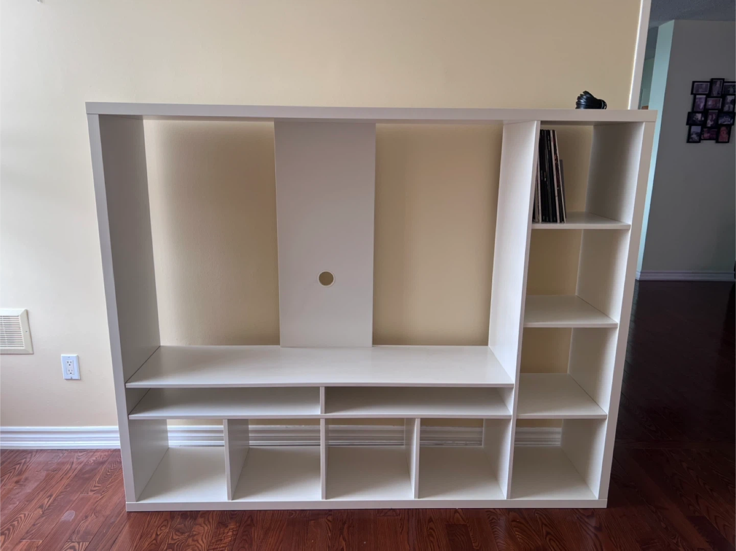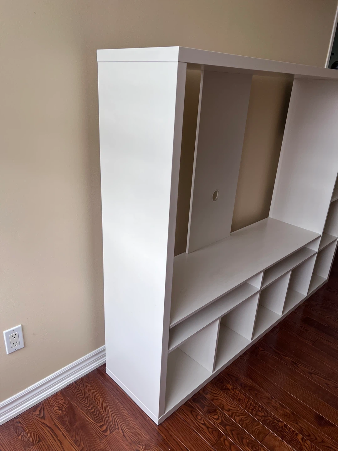 White, good condition. Can fit a 55” TV at most. Has great and lots of storage.