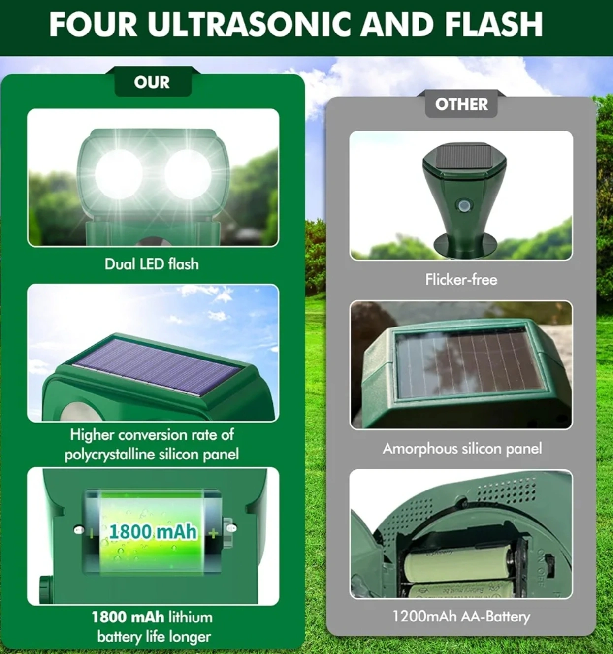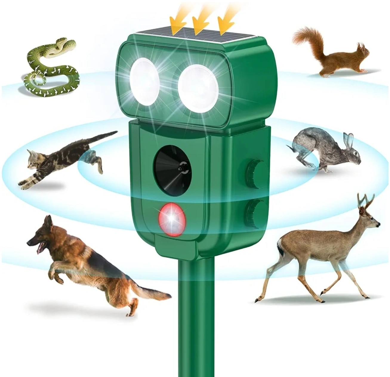 Keep unwanted critters out of your yard with this ultrasonic animal repeller! It features a solar panel for charging, dual LED flash, and adjustable sensitivity settings. It emits multi-frequency ultrasonic waves to deter a variety of animals. Dimensions are 4.3in x 2.36in x 19.7in