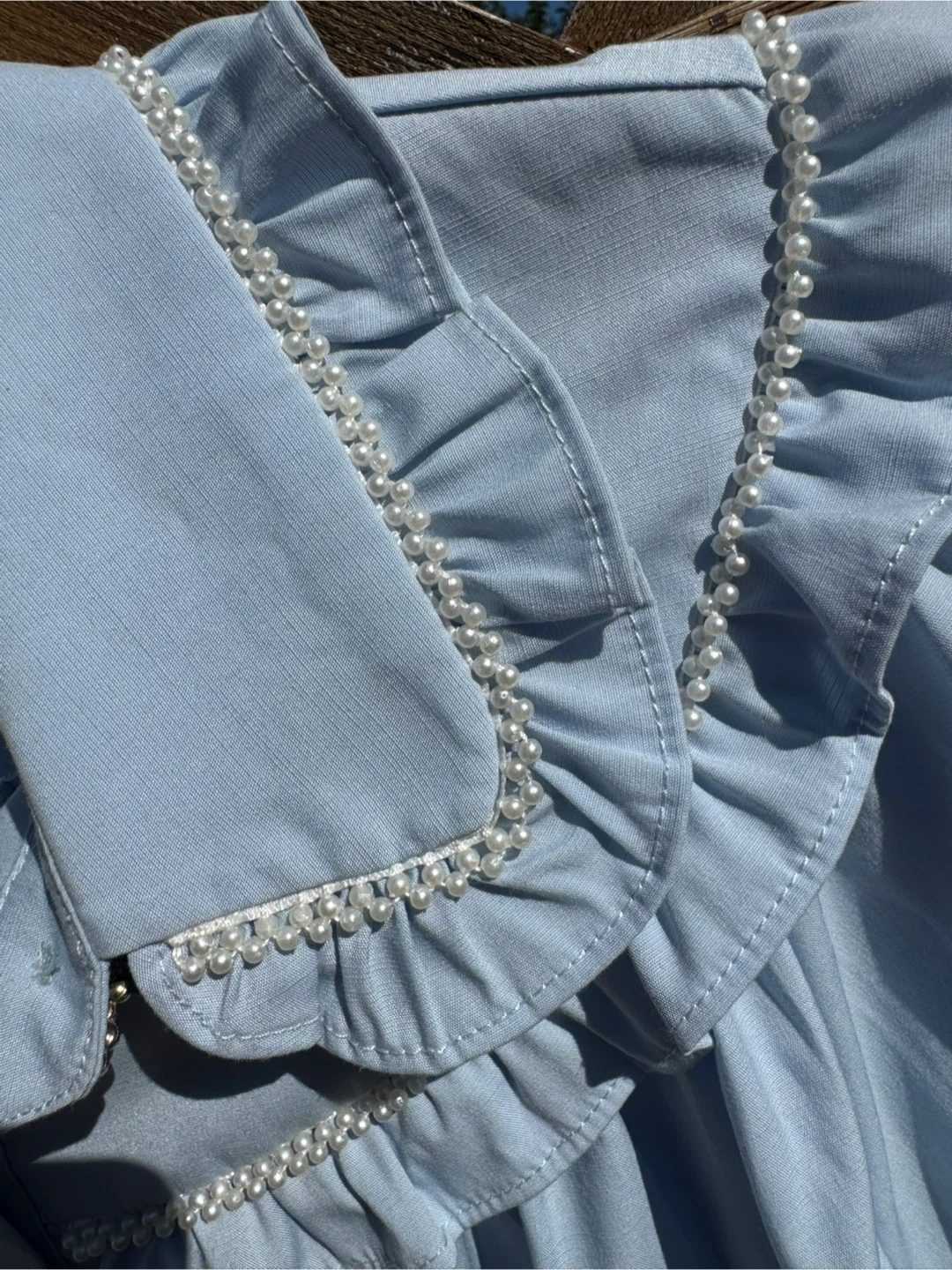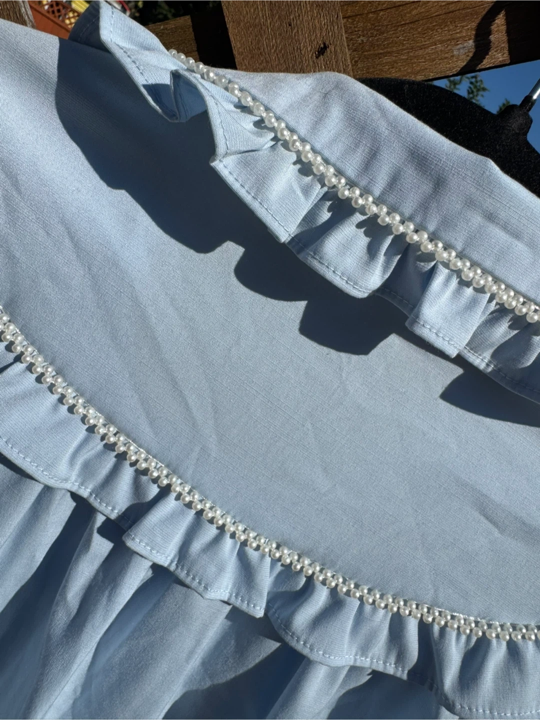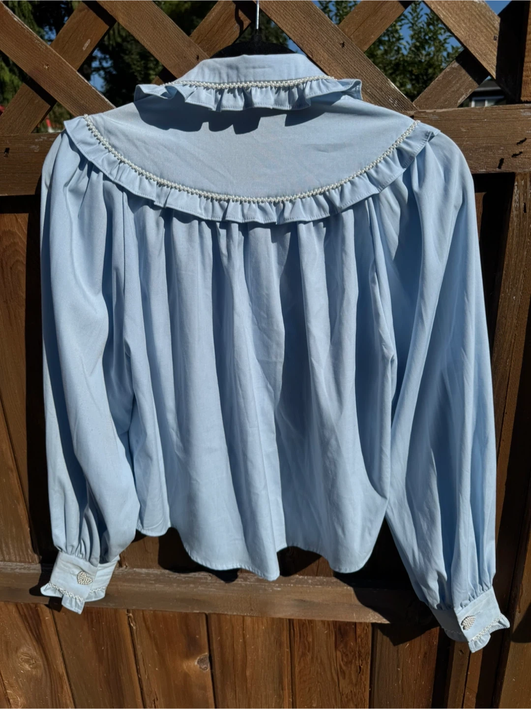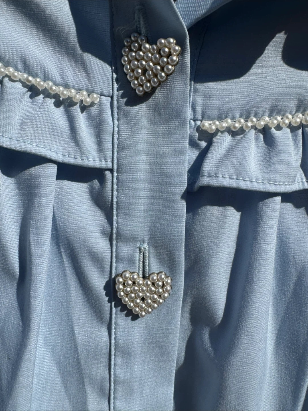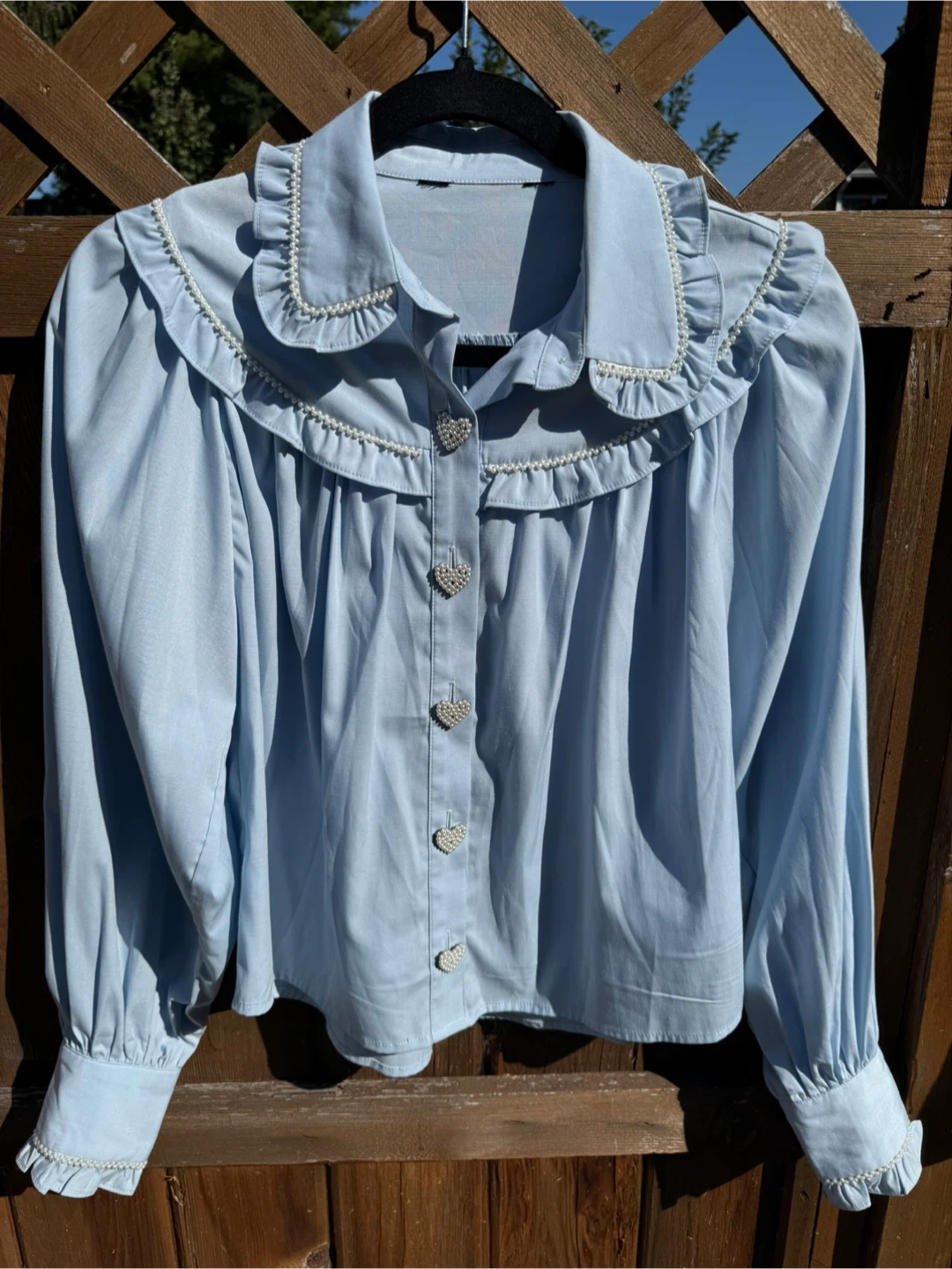 Here's a cute light blue blouse with pearl detailing around the collar and cuffs! It has heart-shaped pearl buttons and a ruffled collar. It's in great condition and ready for a new home!
