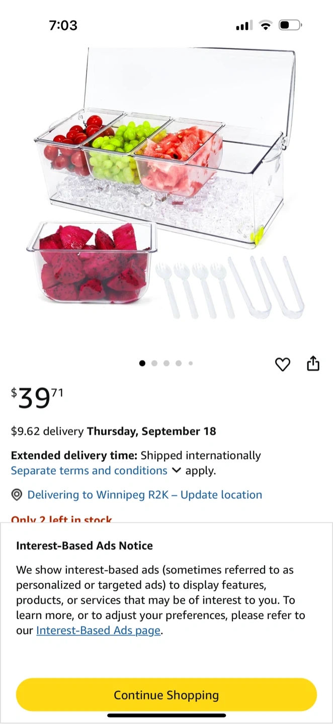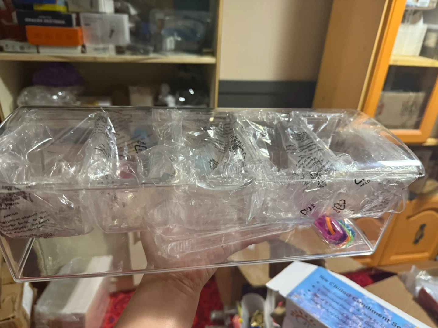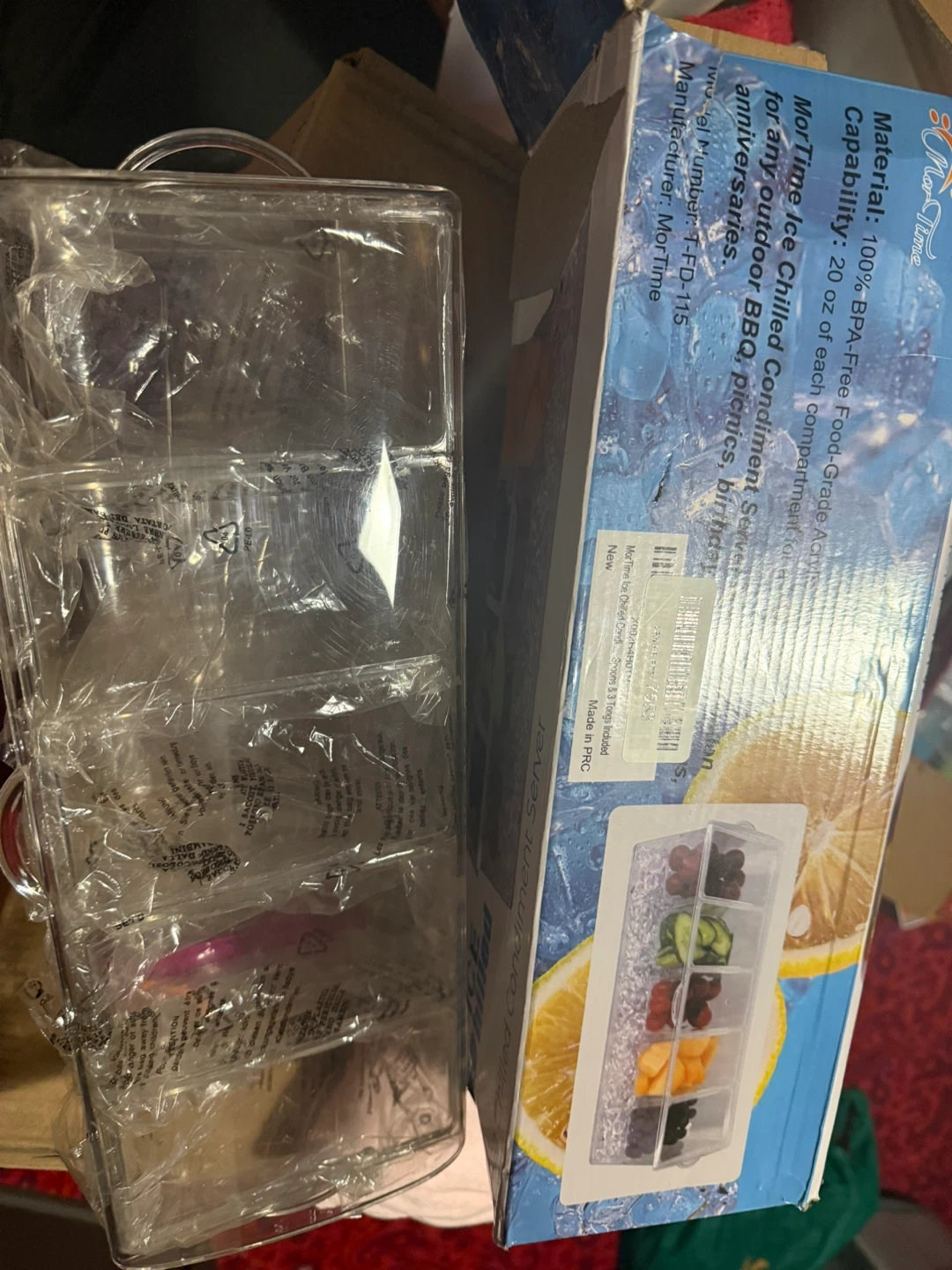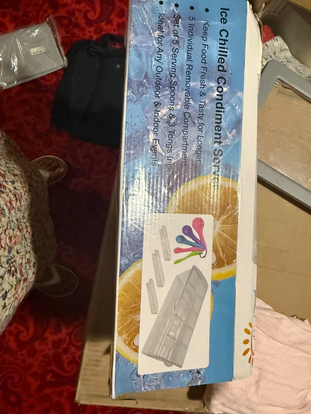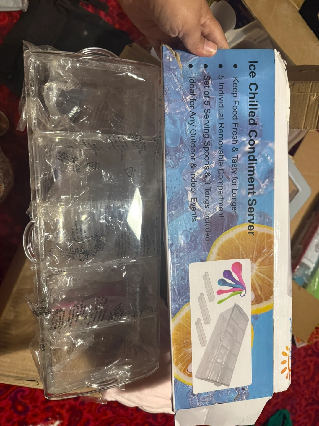 Keep your food fresh and tasty for longer with this ice-chilled condiment server! It features five individual removable compartments and comes with a set of five serving spoons and three tongs. It's ideal for any outdoor or indoor events, and the box is included