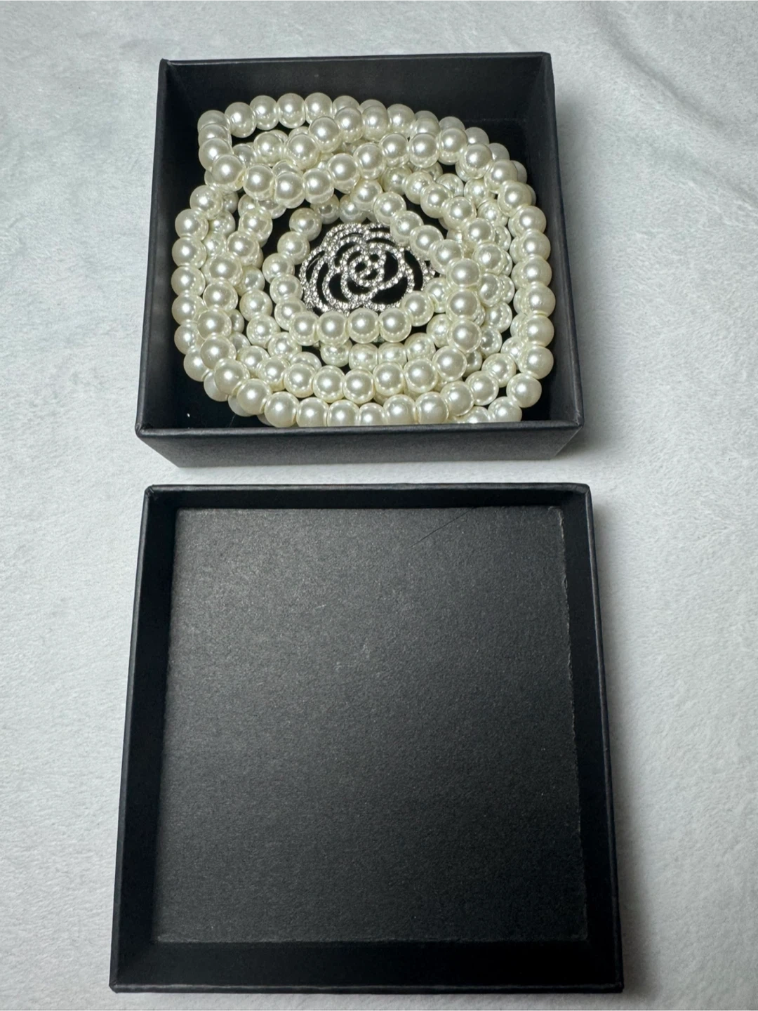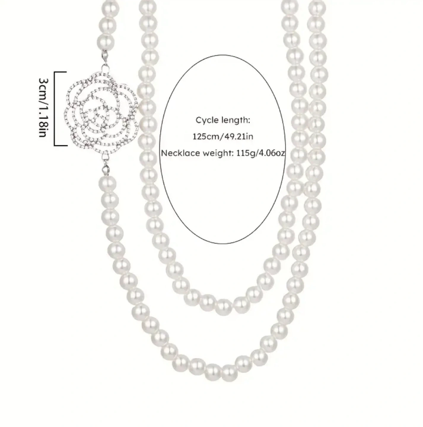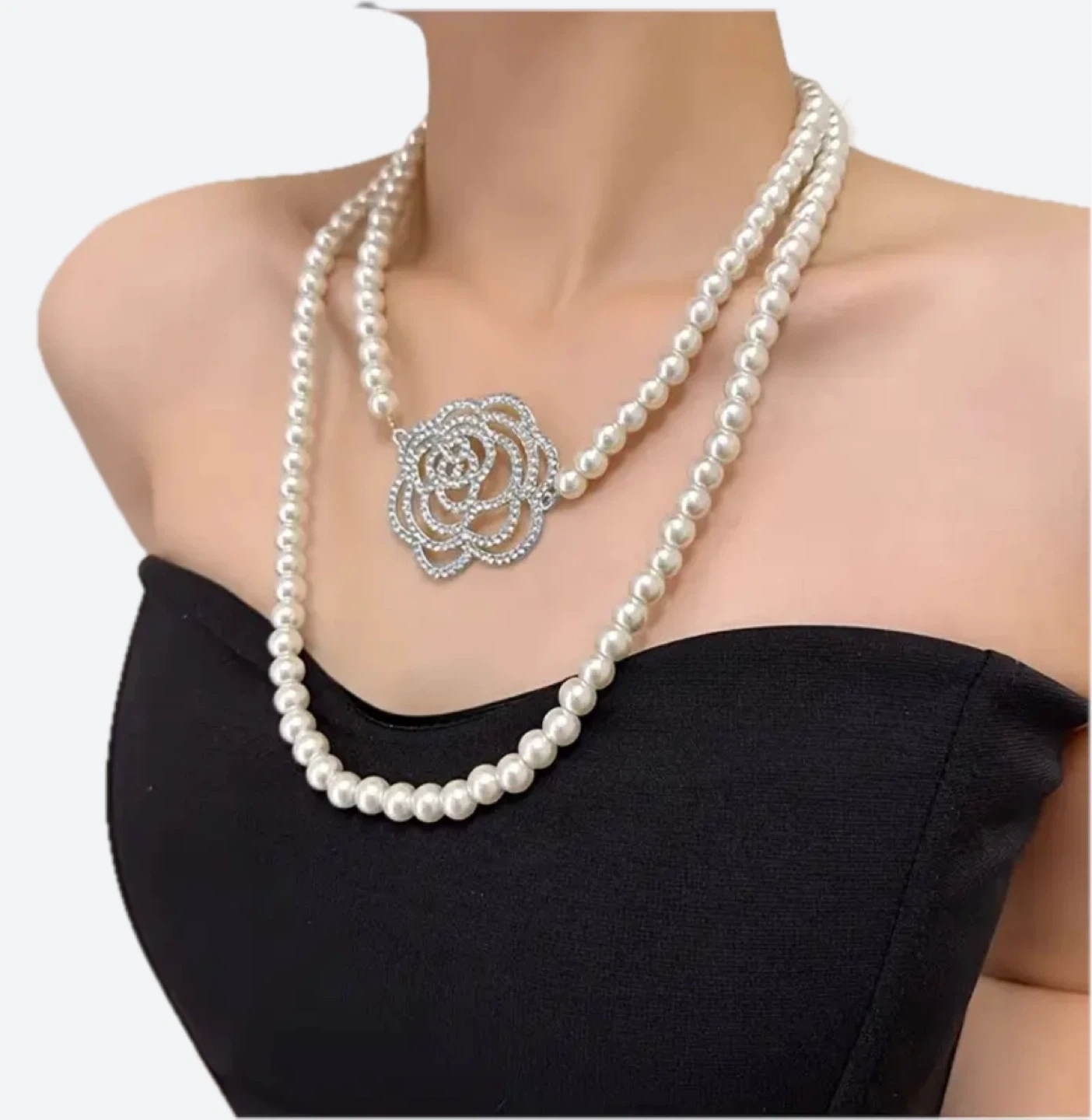 This is a beautiful faux pearl necklace featuring a rose pendant.