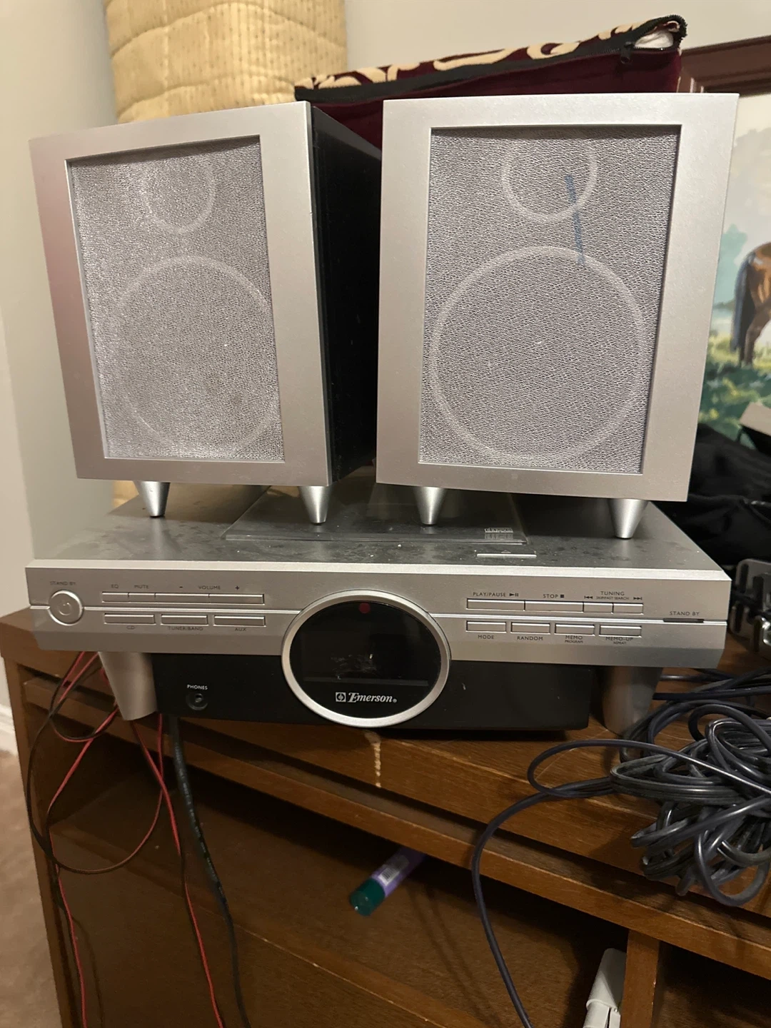Selling an Emerson stereo system that includes the main unit and two speakers. It's in good working condition and would be great for a garage or rec room. The unit has controls for mute, volume, play/pause, tuning, stop, mode, and random