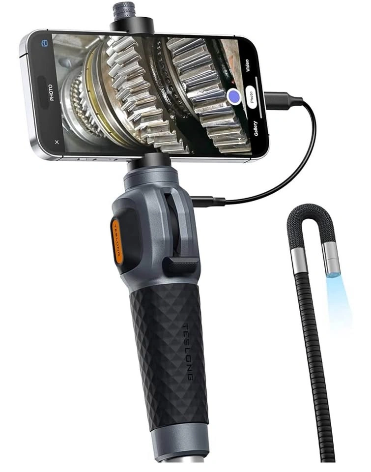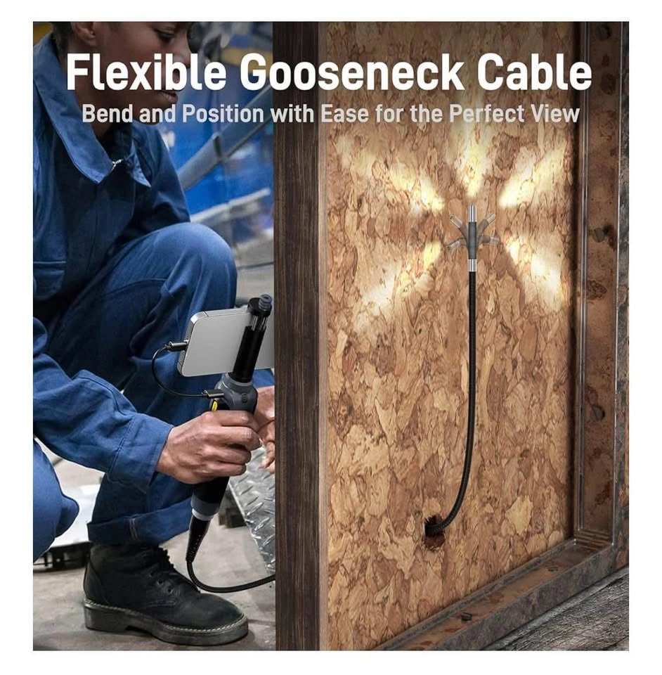 This borescope features a flexible two-way articulating tip that bends max up to 210°, allowing accurate navigation in tight or curved spaces. Easily inspect behind walls, under appliances, or inside pipes without disassembly. Simply plug into your iPhone 15/16, USB-C iPad, or Android 8.0+ phone with OTG. Download the recommended inspection app to get started. Not compatible with Lightning ports, Windows PCs, or MacBooks. The 5-foot semi-rigid gooseneck cable combines flexibility and stiffness, making it ideal for accessing wall cavities, drains, vents, and other household or automotive inspection points. Capture sharp photos and videos using a 1.0MP camera with 1080p resolution. 8 brightness-adjustable LED lights provide excellent visibility in dark or low-light areas. Whether you're troubleshooting a plumbing issue, checking HVAC ducts, or locating a lost item under furniture, this scope offers the versatility to handle everyday household inspections and more. Operate the probe easily with articulating joystick and a conveniently placed photo button. Lightweight and portable, it’s designed for comfort during extended use. Works with USB-C mobile devices only: iPhone 15/16 above series, USB-C iPads, and Android phones (8.0+) with OTG enabled. Not compatible with Lightning-based devices, PCs, or MacBooks.