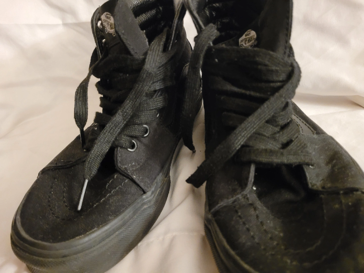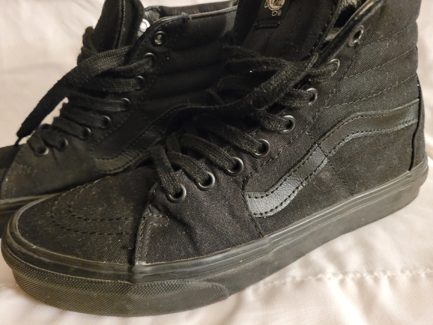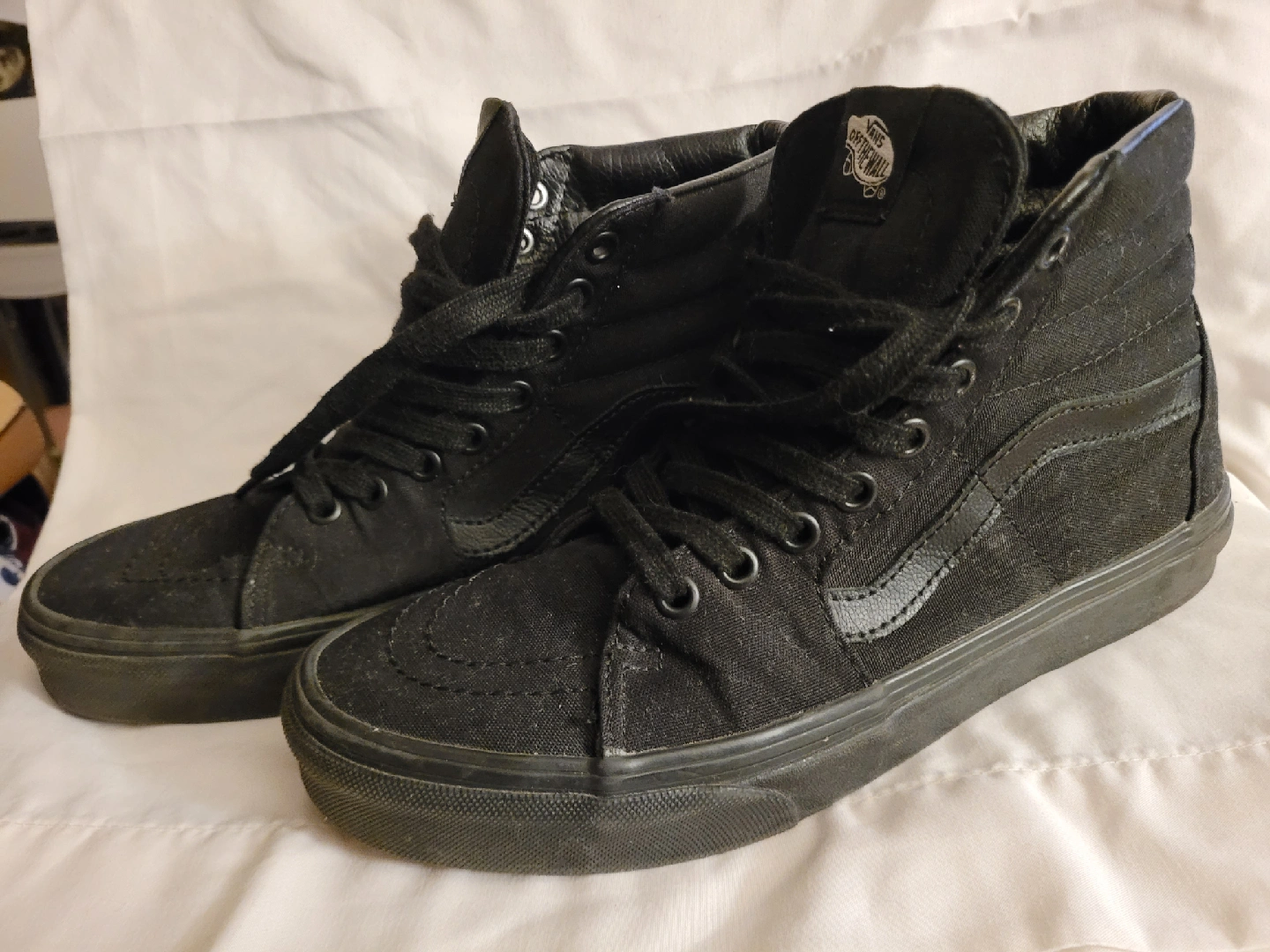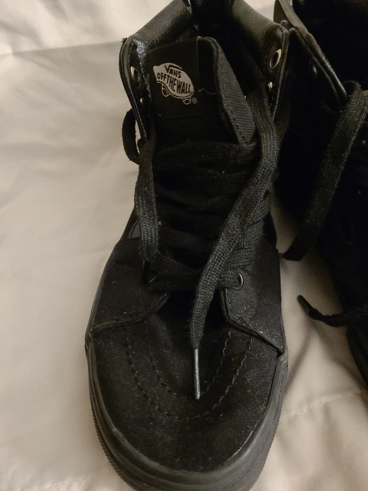 Selling a pair of Vans Sk8-Hi in all black! These high-tops are in used condition but still have plenty of life left. Perfect for skating or just everyday wear. Gently worn.