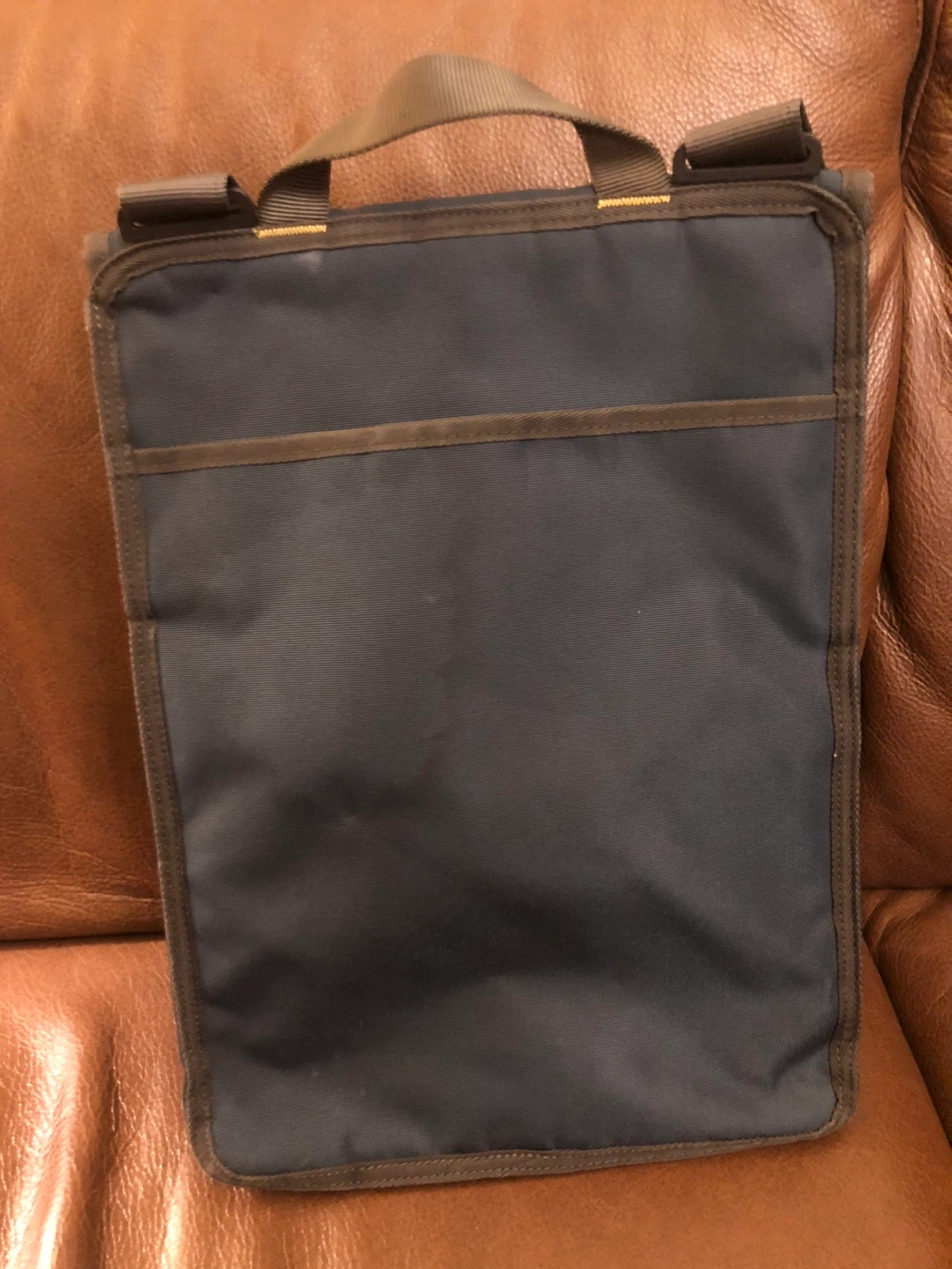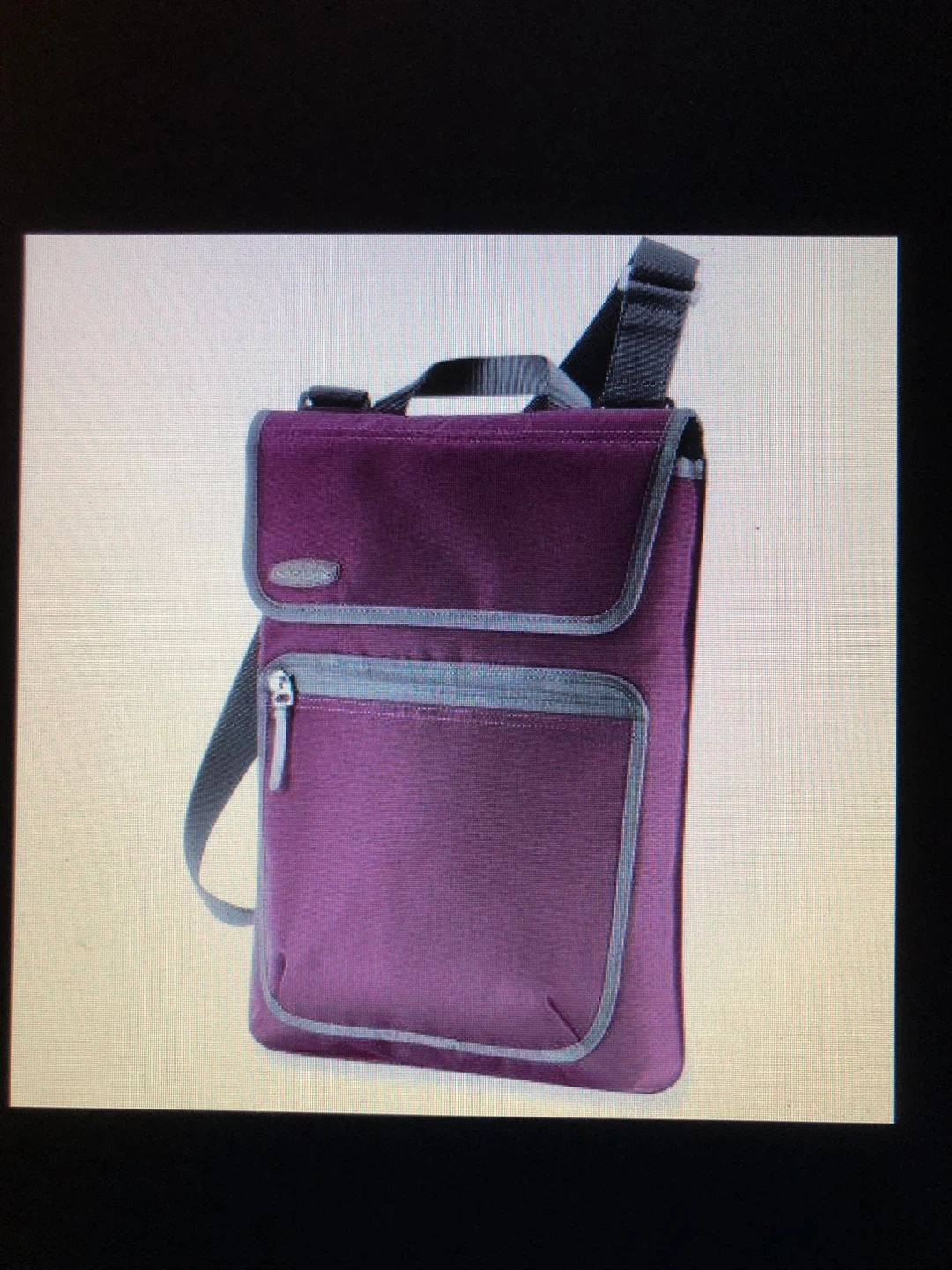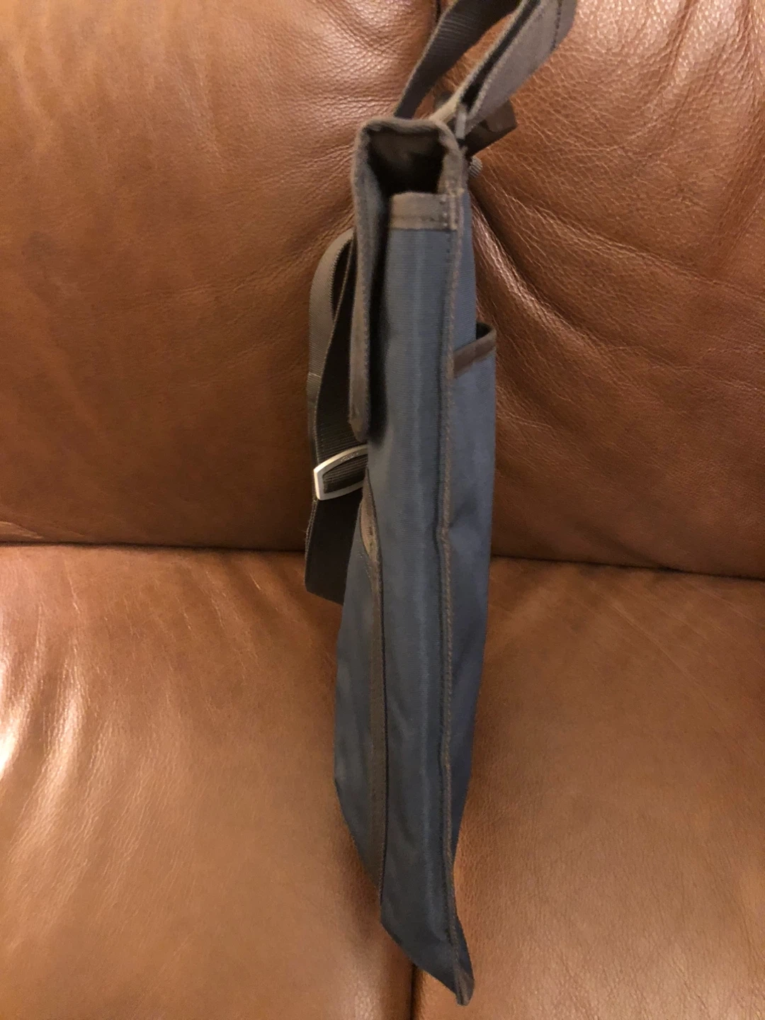 A slim, steel-blue satchel in perfect, unused condition. Padded, fits15-inch laptop. Greyish blue colour (not purple like commercial photo) with adjustable shoulder strap, zippered accessory front pocket, and large back pocket.