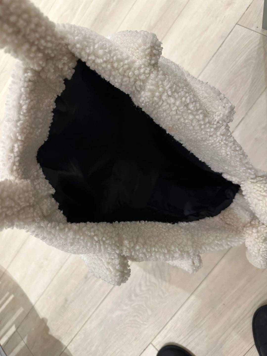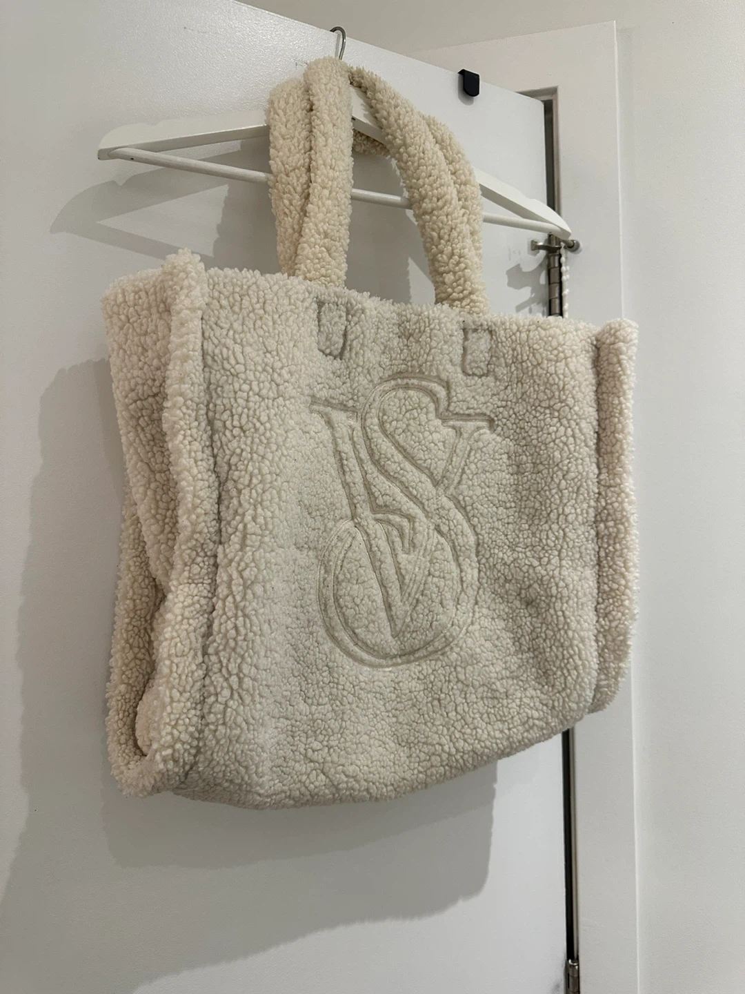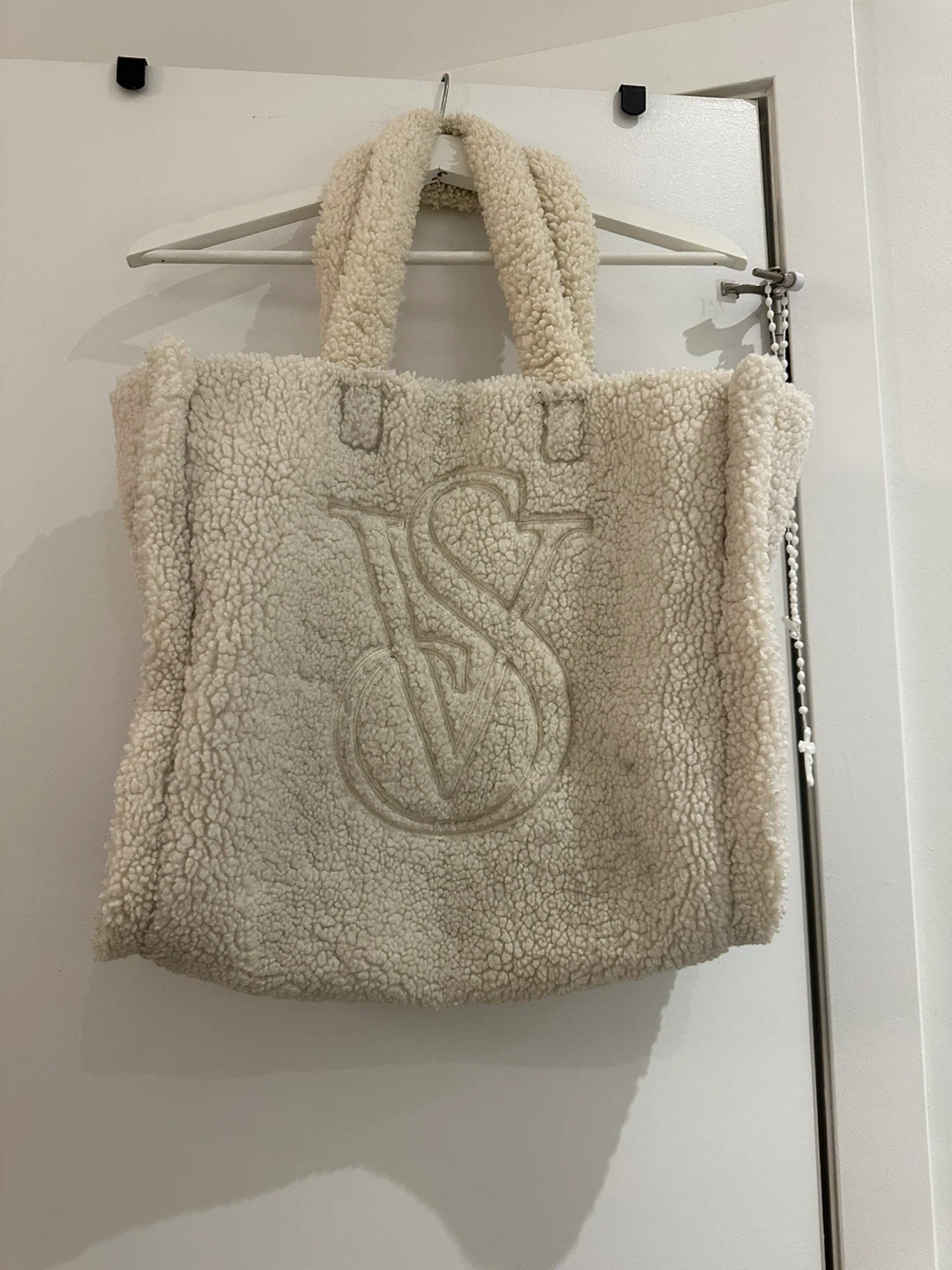 Selling a Victoria's Secret tote bag made of cream-coloured sherpa material. It's in great condition and ready for a new home! The bag features the classic VS logo on the front and has a black interior lining.