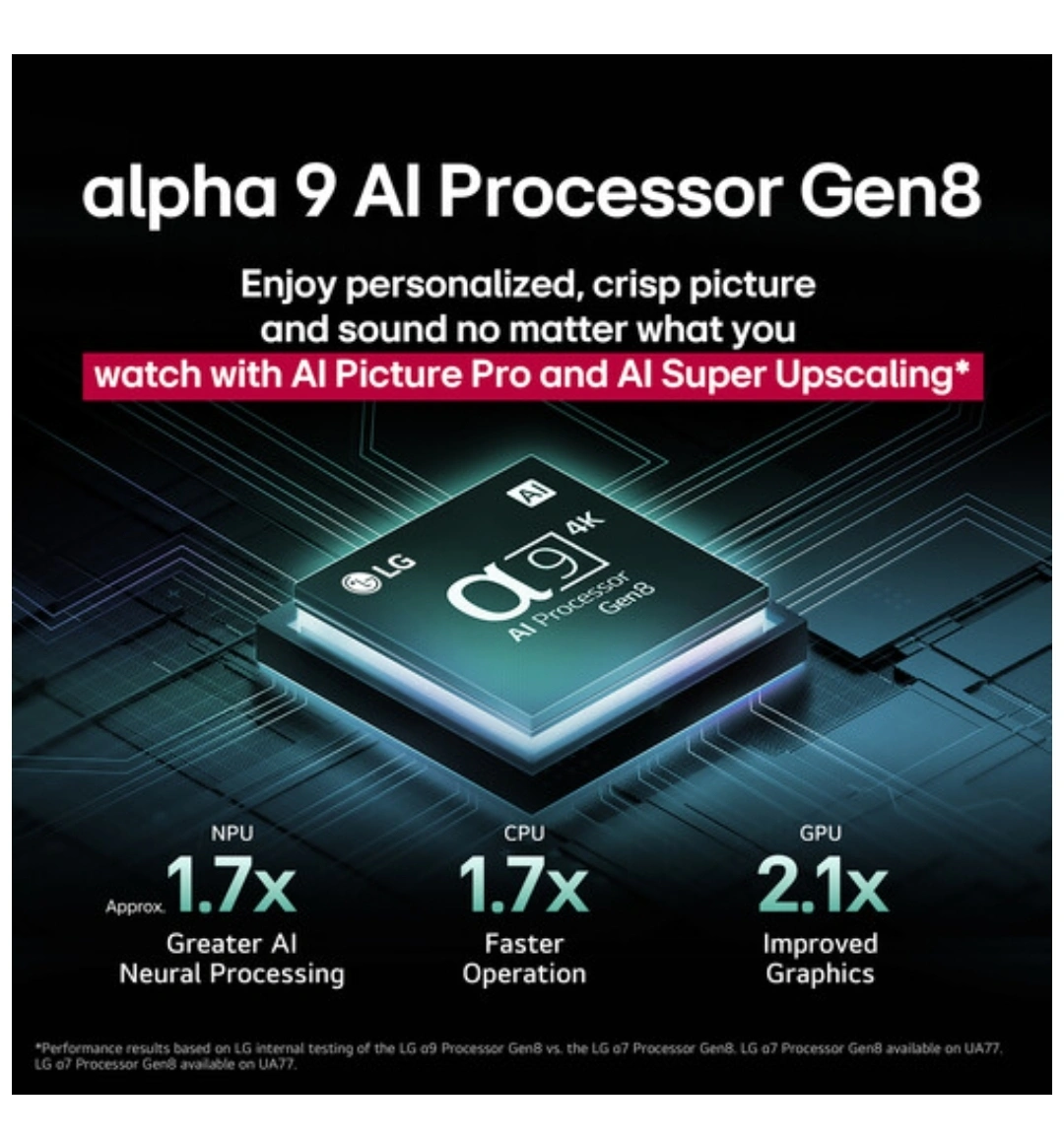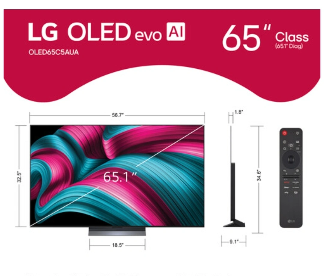 65LG 65" C5 Series 4K UHD OLED evo AI Smart webOS 25 TV, OLED65C5PUA Highlights UHD 4K 3840 x 2160 OLED Panel HDR10, HLG, Dolby Vision Compatible webOS 25 with a9 Gen 8 AI Processor 120 Hz Native Refresh Rate ALLM, FreeSync Premium, VRR & G-SYNC 0.1 ms Response & Up to 144 Hz Refresh 4 x HDMI 2.1 / 3 x USB 2.0 Inputs Wi-Fi 6E & Bluetooth 5.3 Connectivity Works with Alexa, Airplay & Google Cast Ultra-Slim with Nearly Invisible Bezel NEW with Warranty EASY FINANCING AVAILABLE