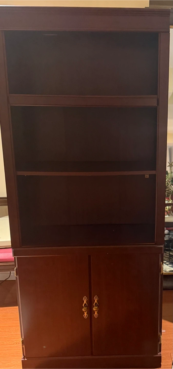 Selling a wooden bookcase with a cabinet at the bottom. It has a classic look and would be great for storing books or displaying items. The cabinet provides extra storage space. Perfect for a living room, study, or office!