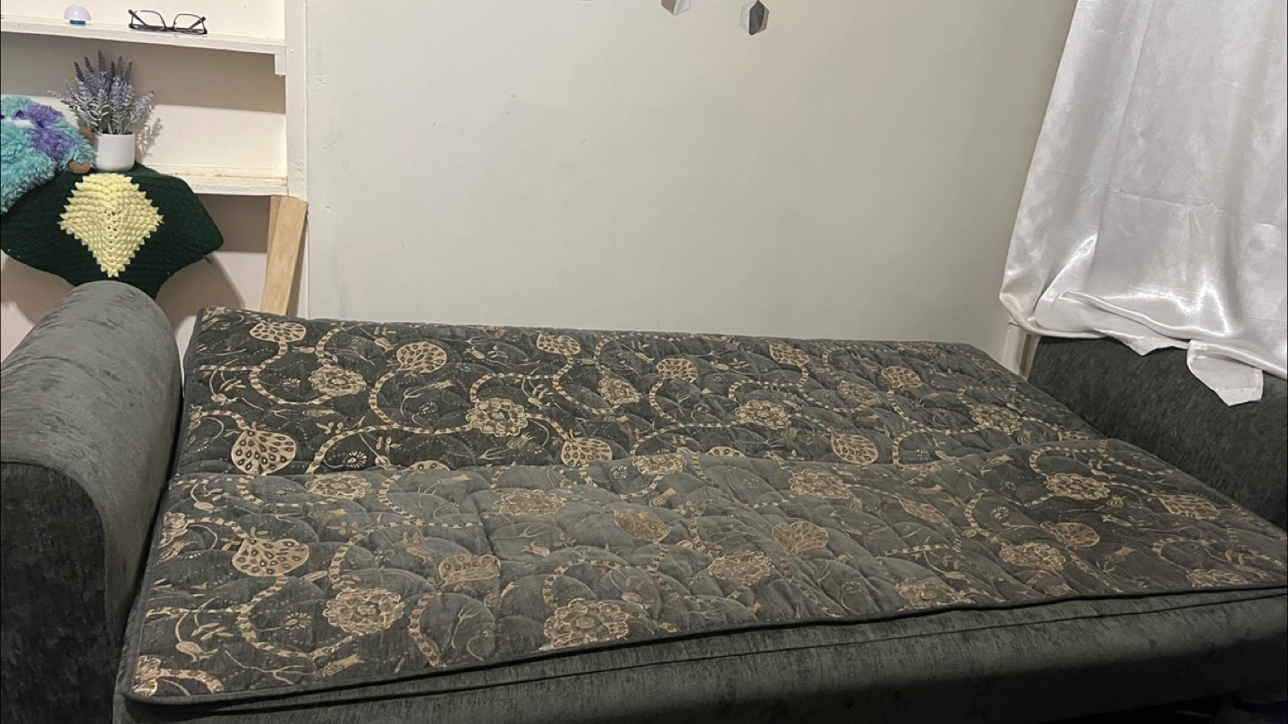 Selling a sofa bed with a unique floral pattern. It's in good condition and ready for a new home. The color is a dark gray, and the material feels like a soft velvet.