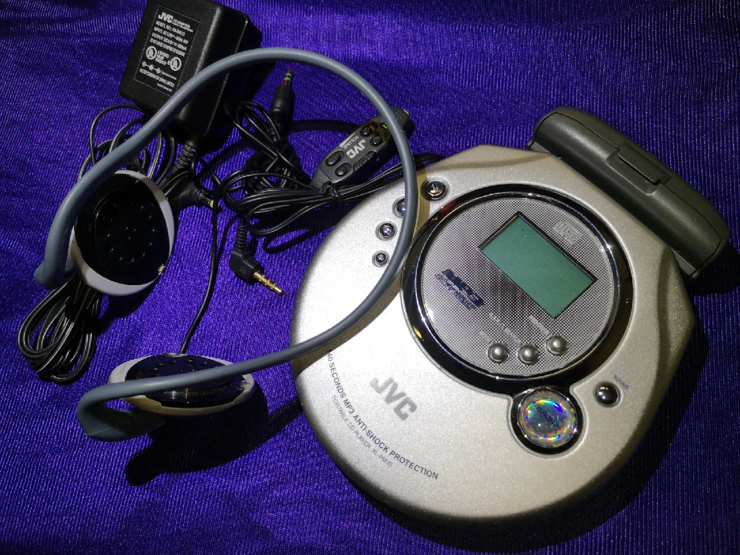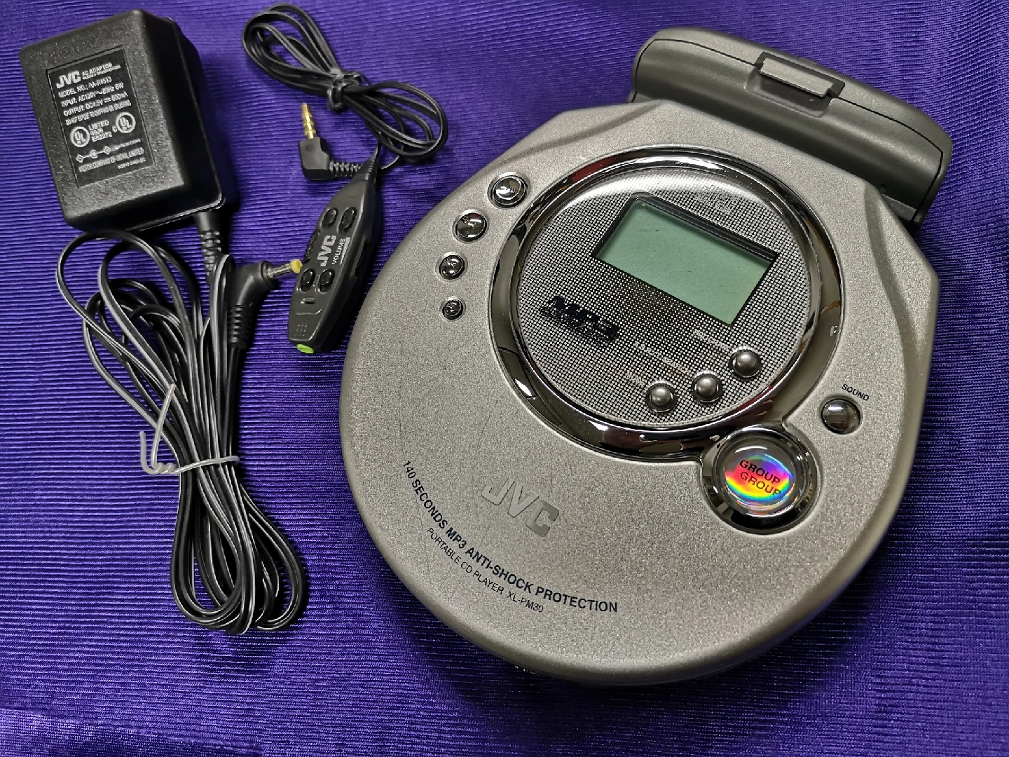 A premium MP3 CD player by JVC, class 1 Laser product. JVC quality. Model #: XL-PM30SL Battery: - 1.2V x 2 (BN-R1211J) - 1.5V x 2 (LR6, Size AA) DC in: - 4.5V - Extra detachable battery pack. - Fits 4x AA batteries. - DC Charger. - Wrap around headphones (need new foam earmuffs). - External volume control on headphone wire. - Original user manual. - Additional padded case by Jensen. - Plays regular CDs, burned CDs + MP3 CDs. - Exterior is in fantastic shape.
