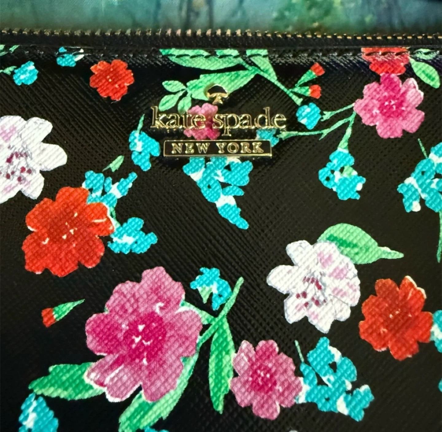 kate spade New York Black with Multicolored Floral Design Wristlet Pouch.