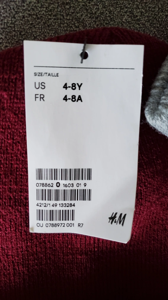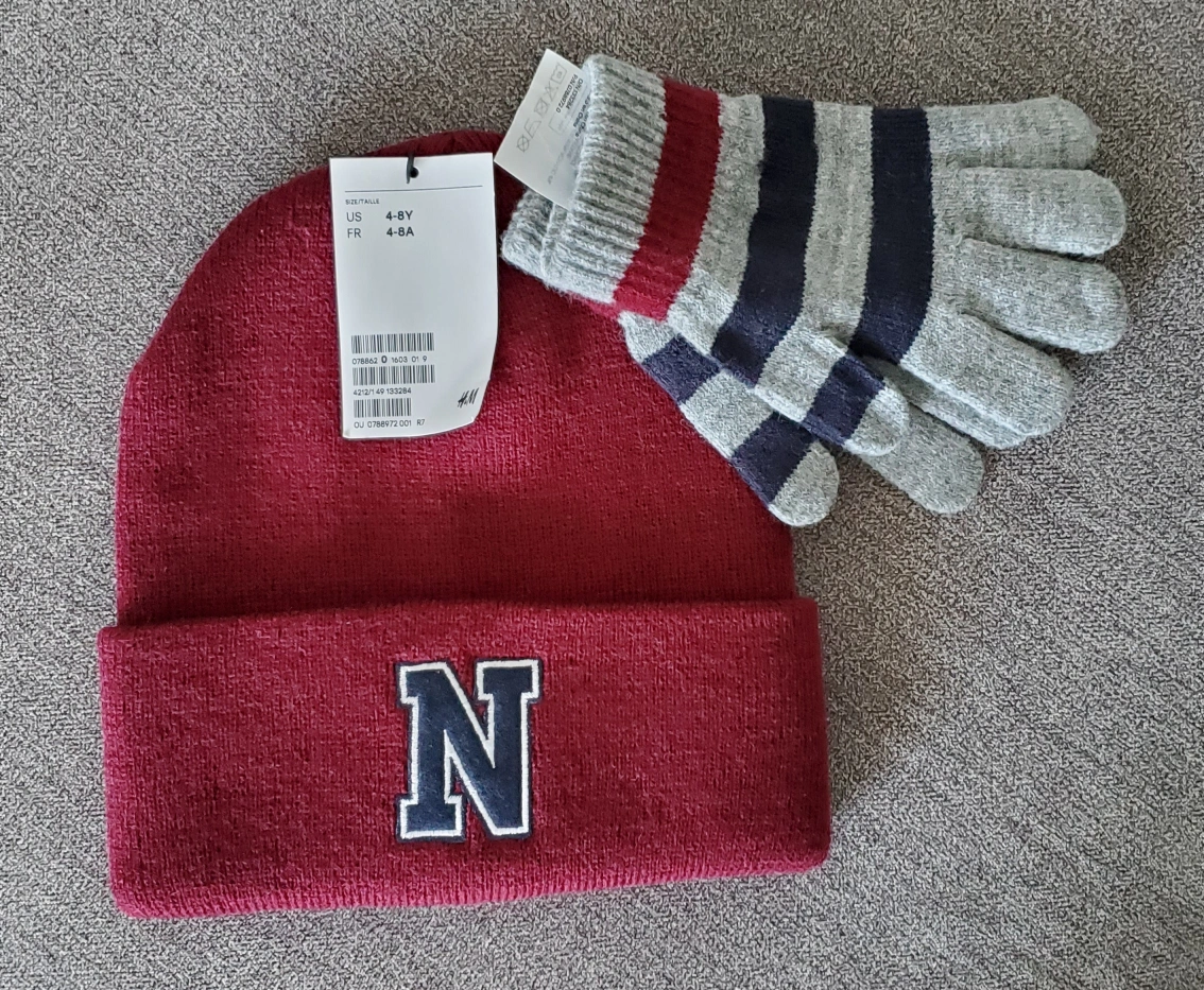 I'm selling a new H&M hat and gloves set for kids! The size is 4-8 years. The hat is a nice red colour with a letter 'N' on the front, and the gloves are striped grey, red, and navy blue. Perfect for keeping your little one warm and stylish!