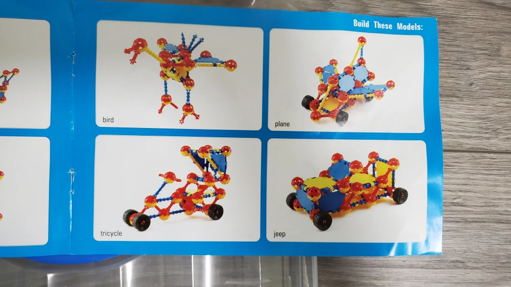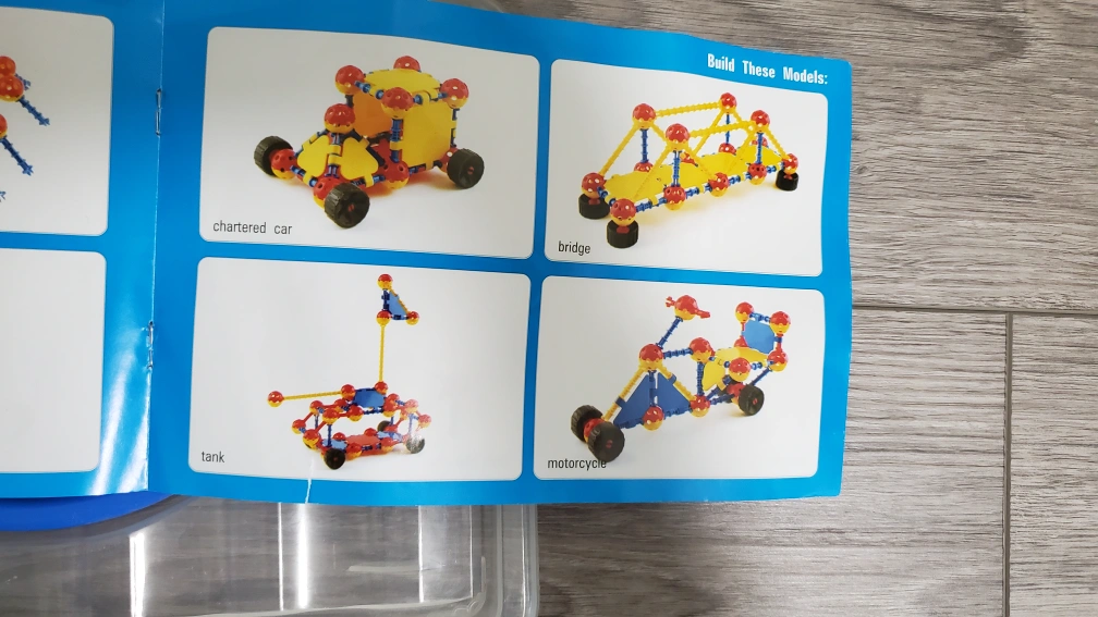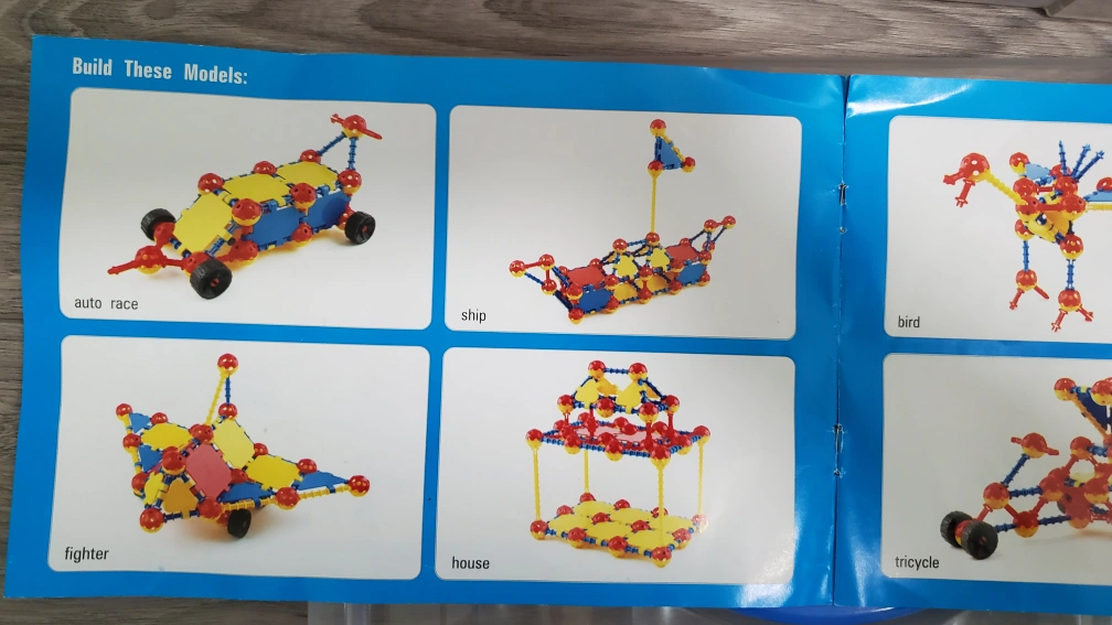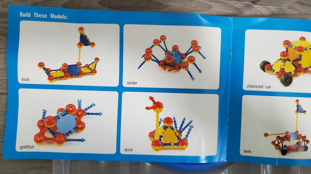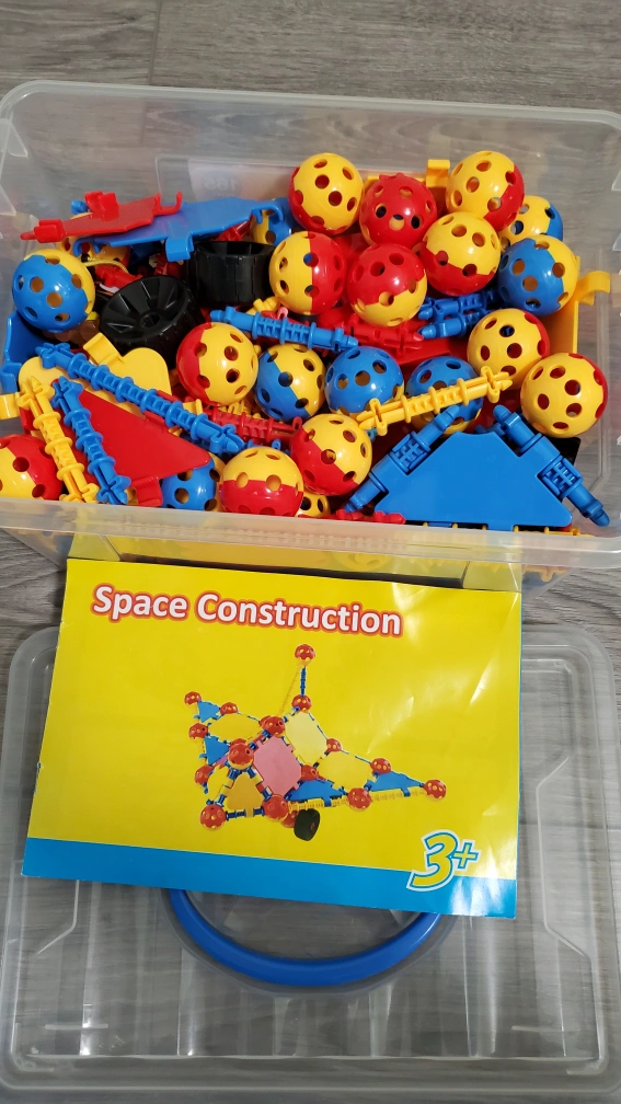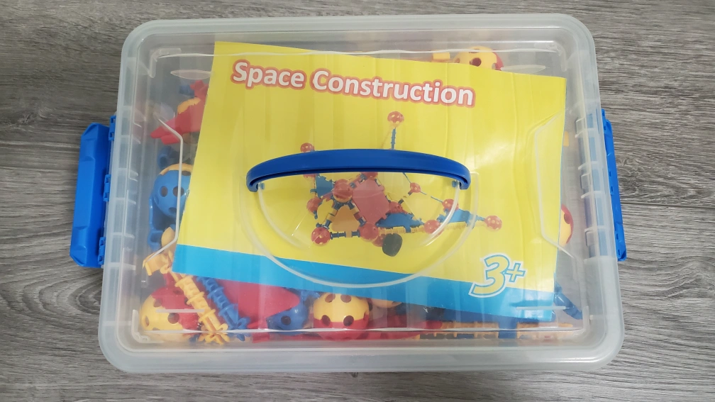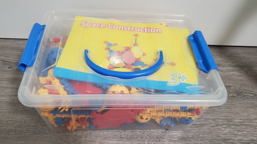 Space Construction building toy set for ages 3+. Comes in a clear plastic container with blue handles. Includes instructions to build models like a car, ship, bird, fighter, house, tricycle, plane, jeep, boat, spider, chartered car, goldfish, duck, and tank