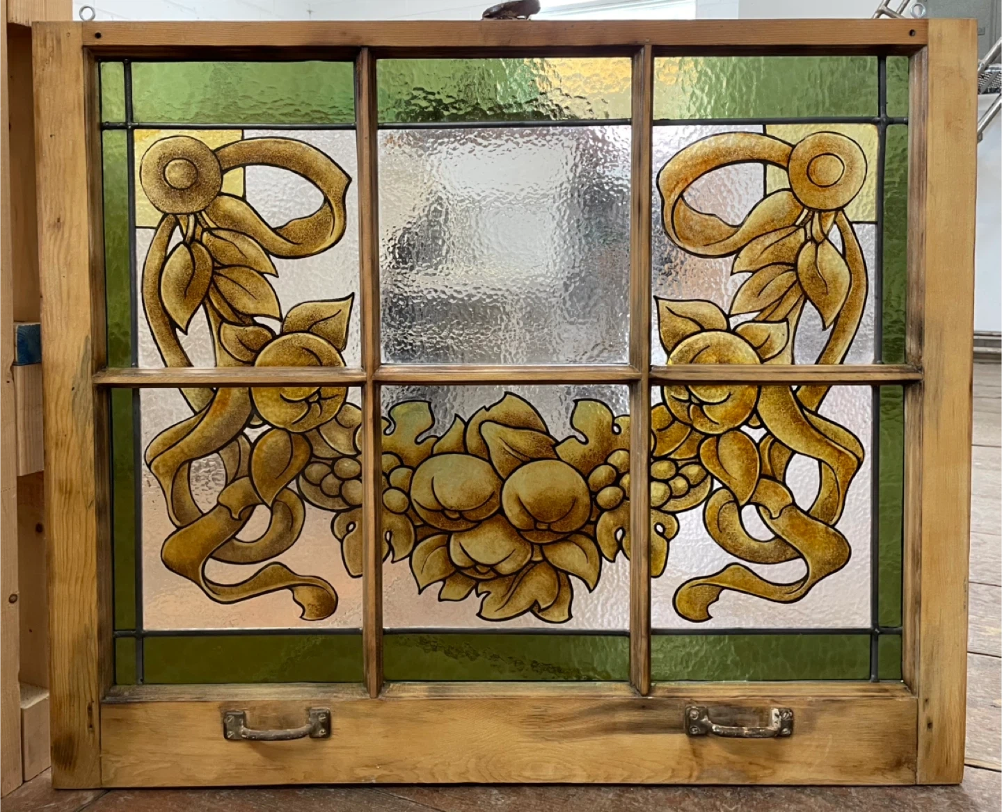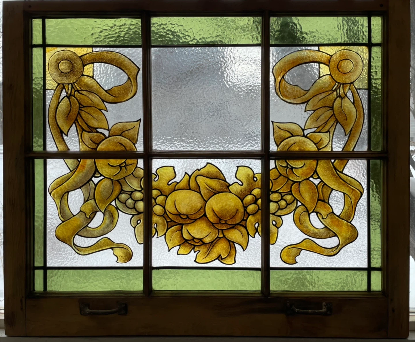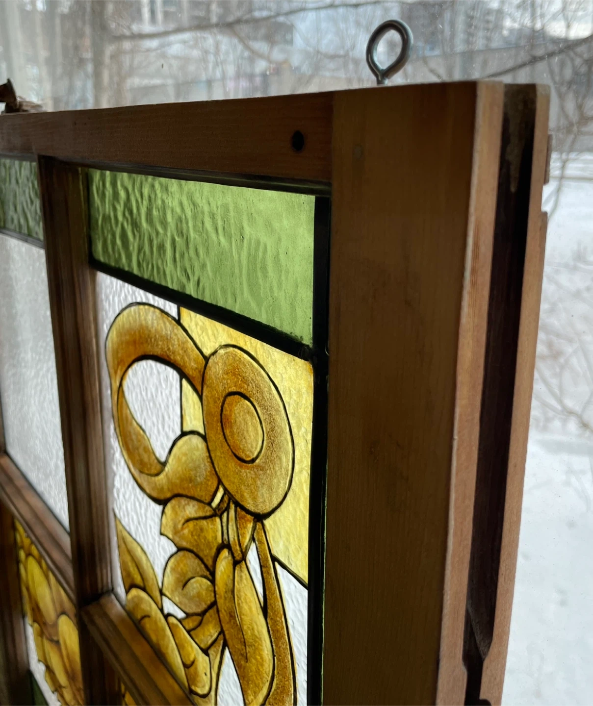 Beautifully painted kiln fired stained glass window panel with a unique floral and ribbon design. It features a wooden frame and two eye hooks for hanging. Would be a lovely addition to any home!