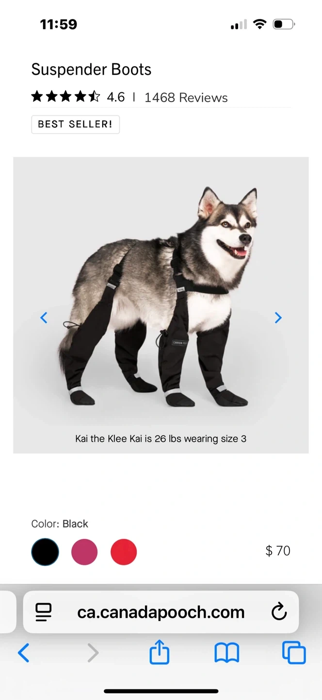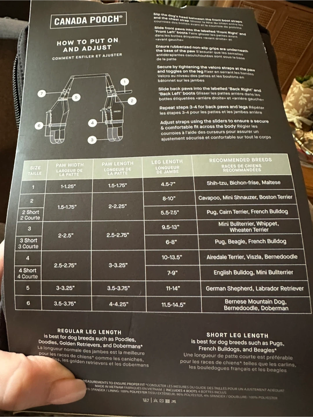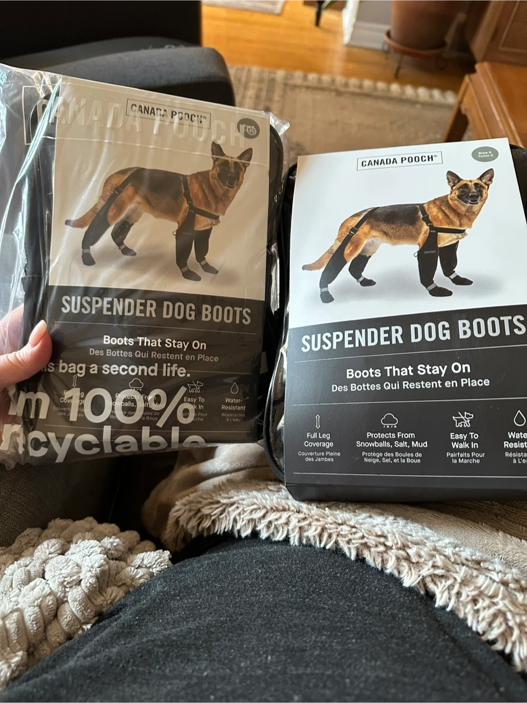 Selling a brand new pair of Canada Pooch Suspender Dog Boots in size 2 and black! These boots are designed to stay on, offering full leg coverage and protection from snowballs, salt, and mud. They make it easy to walk in any weather. The packaging includes instructions on how to put them on and adjust them for a comfortable and secure fit for your furry friend