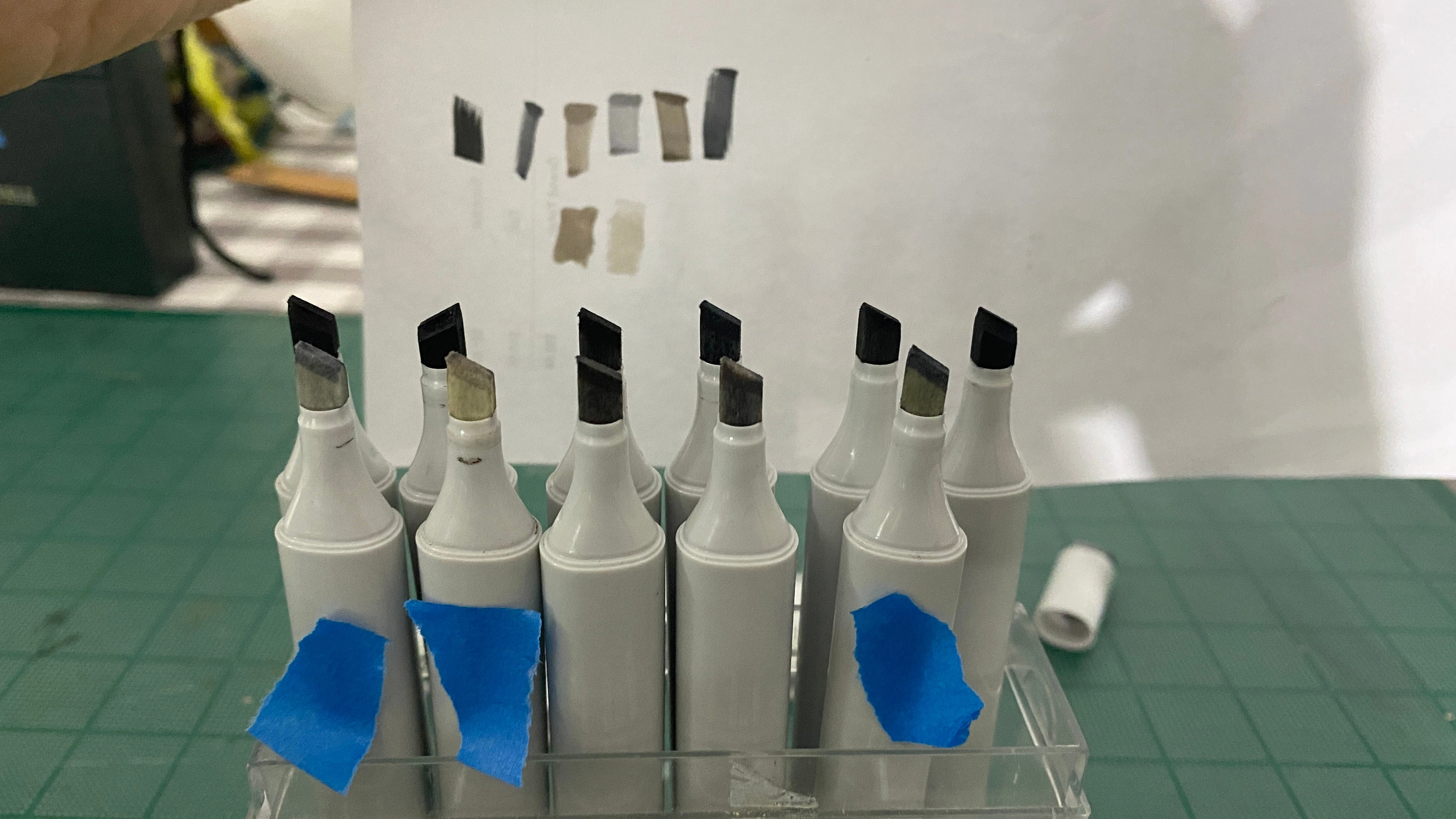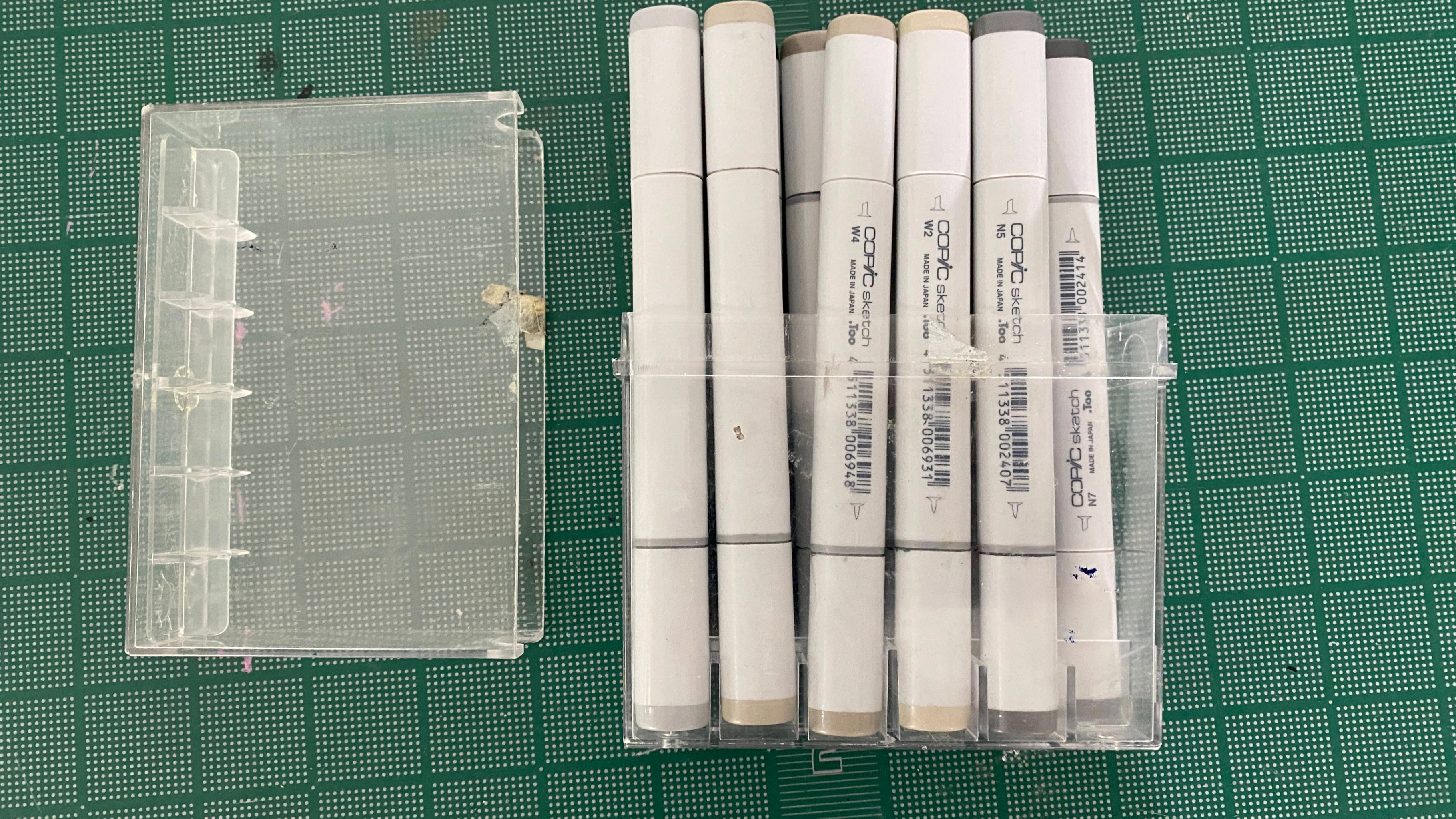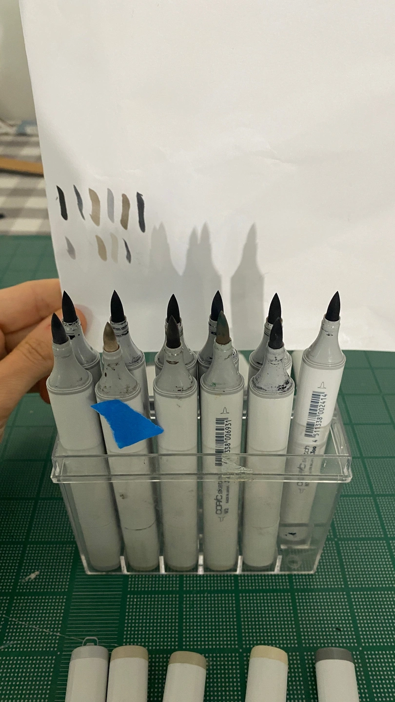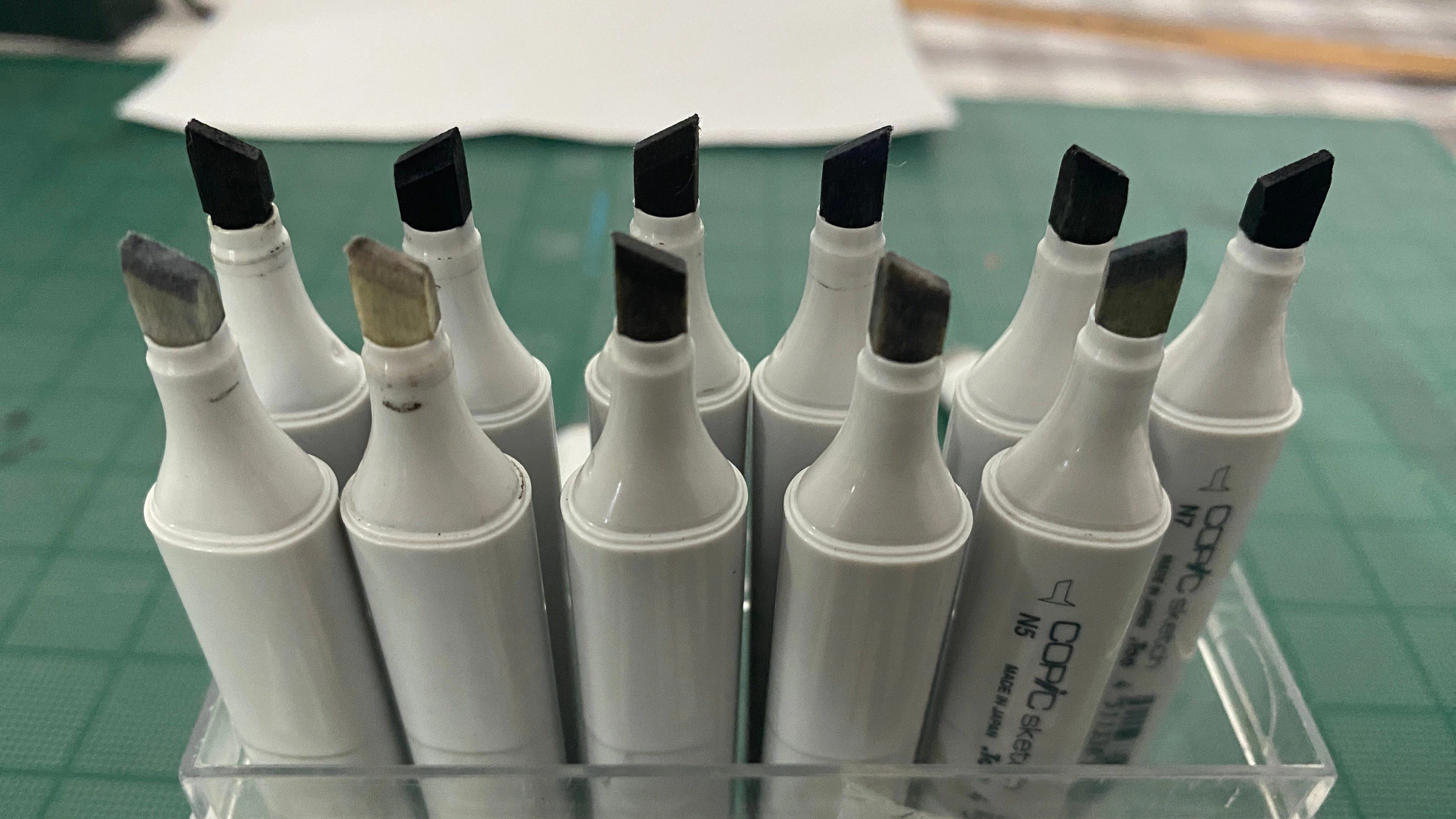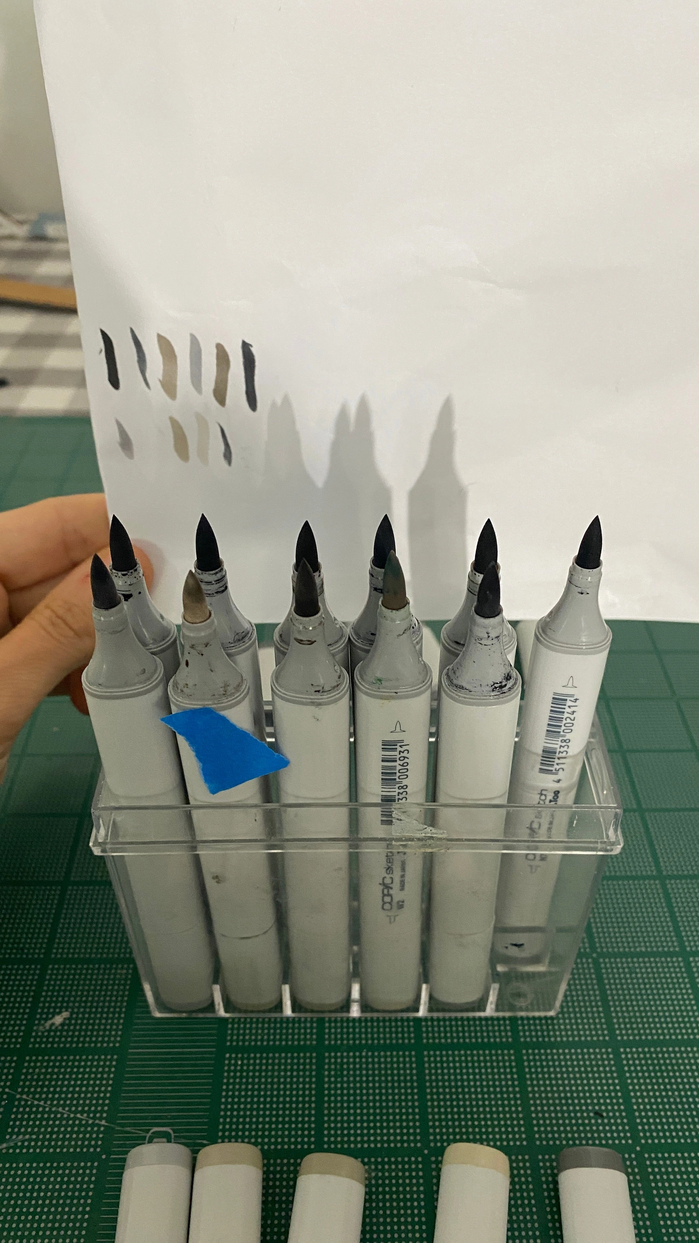 11 copic sketch markers. These are re-usable! you can refill the ink and switch the nibs. 4 nibs are dried out as you can see in the photos marked by blue tape. I'm not sure if you need to get new nibs or just change the ink. Maybe you can re-wet them but i've never tried.