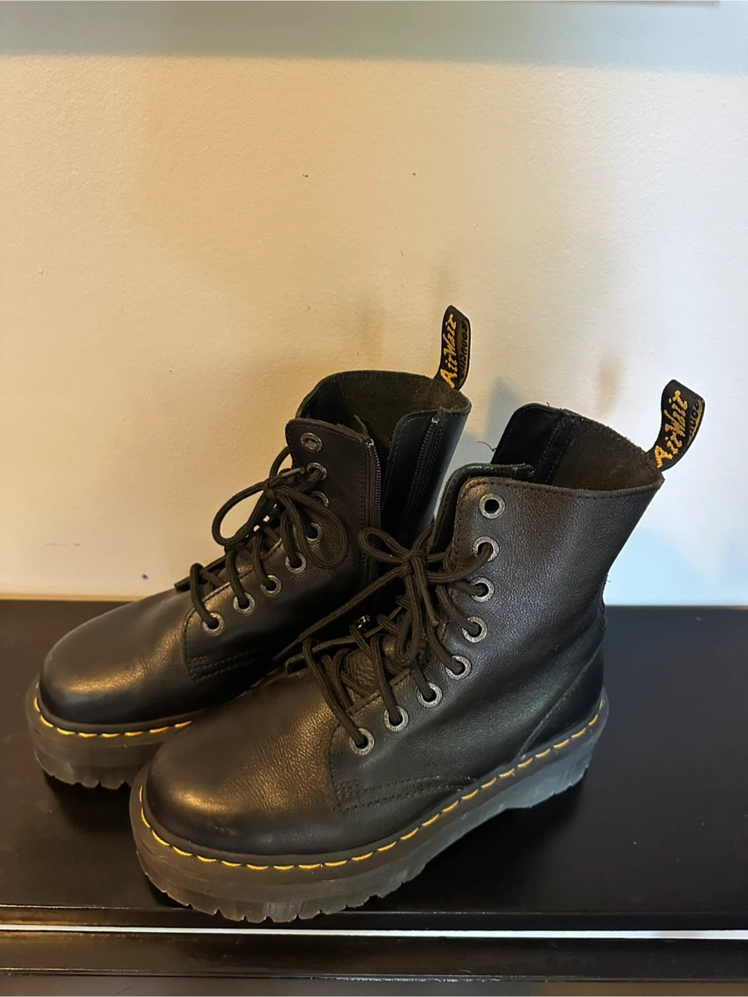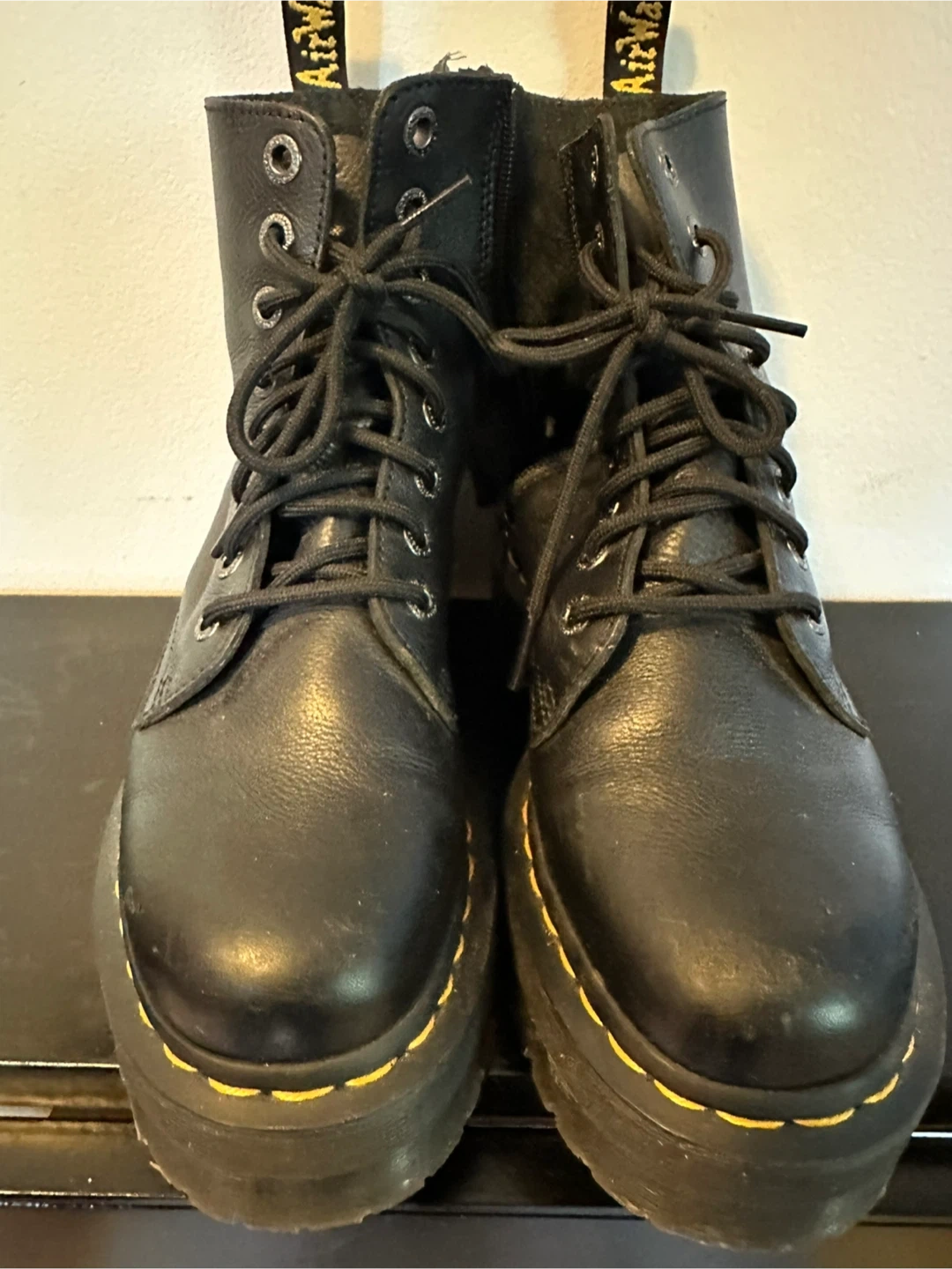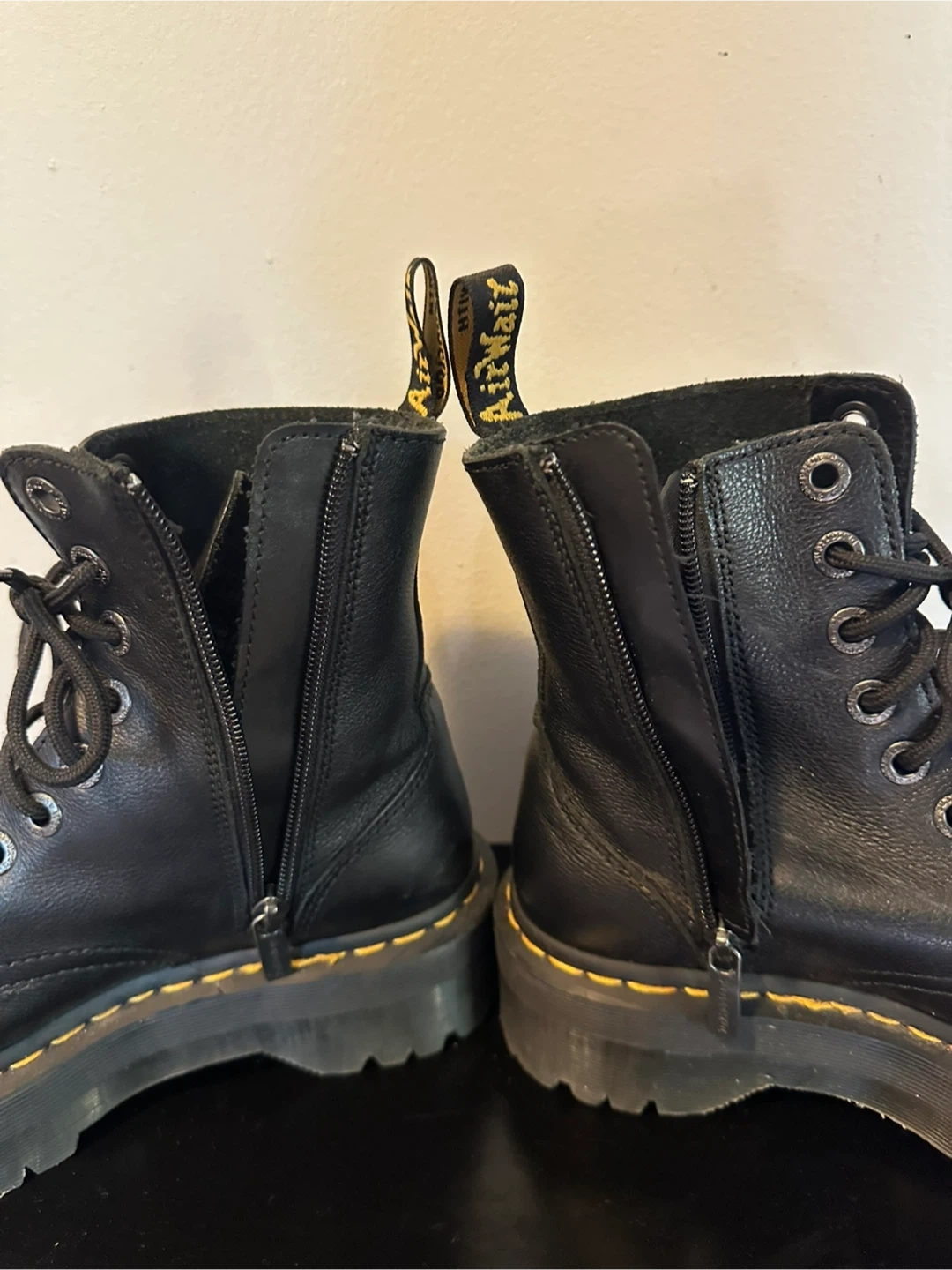 Selling a pair of Dr. Martens Jadon III platform boots in US size 7! These are black leather boots with a chunky platform sole and the classic yellow stitching. They have a side zipper for easy on and off. Perfect for adding a bit of edge to any outfit!