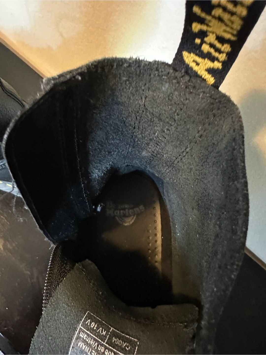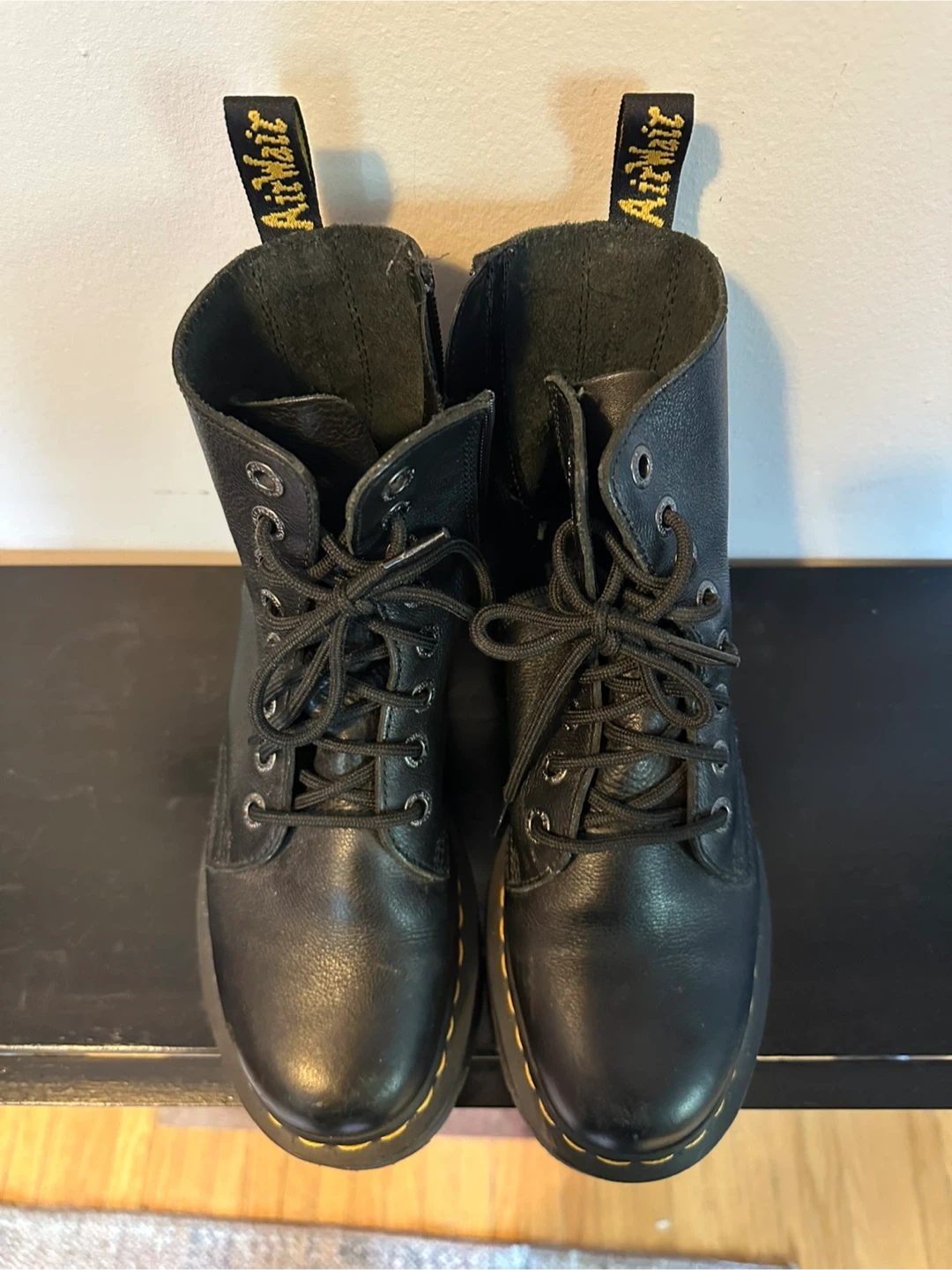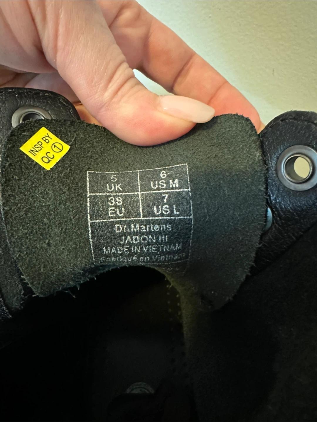 Selling a pair of Dr. Martens Jadon III platform boots in US size 7! These are black leather boots with a chunky platform sole and the classic yellow stitching. They have a side zipper for easy on and off. Perfect for adding a bit of edge to any outfit!