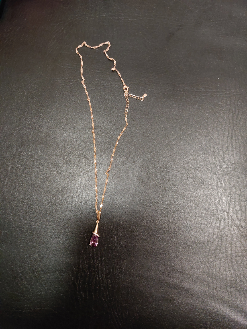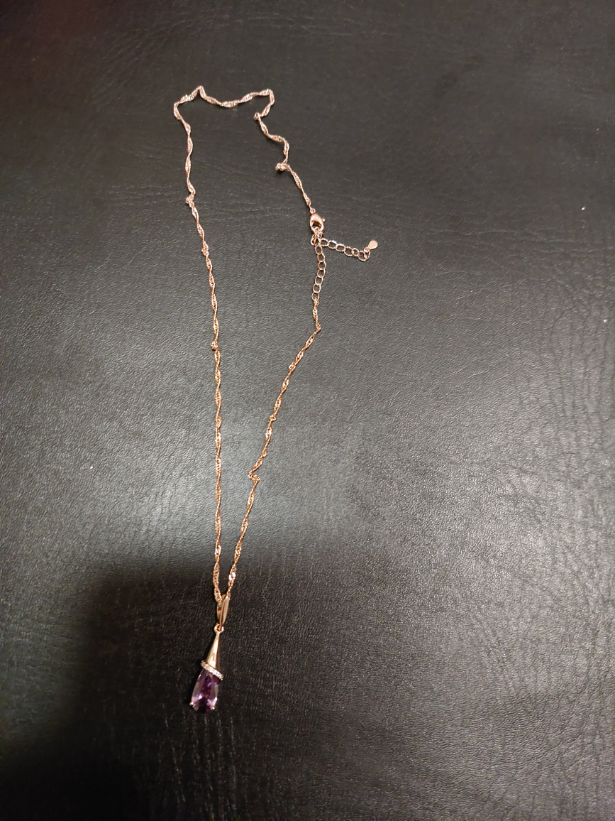 Selling a lovely rose gold necklace with a purple stone pendant. It's in great condition and has a delicate chain. The necklace is perfect for adding a touch of elegance to any outfit. Feel free to reach out if you're interested!