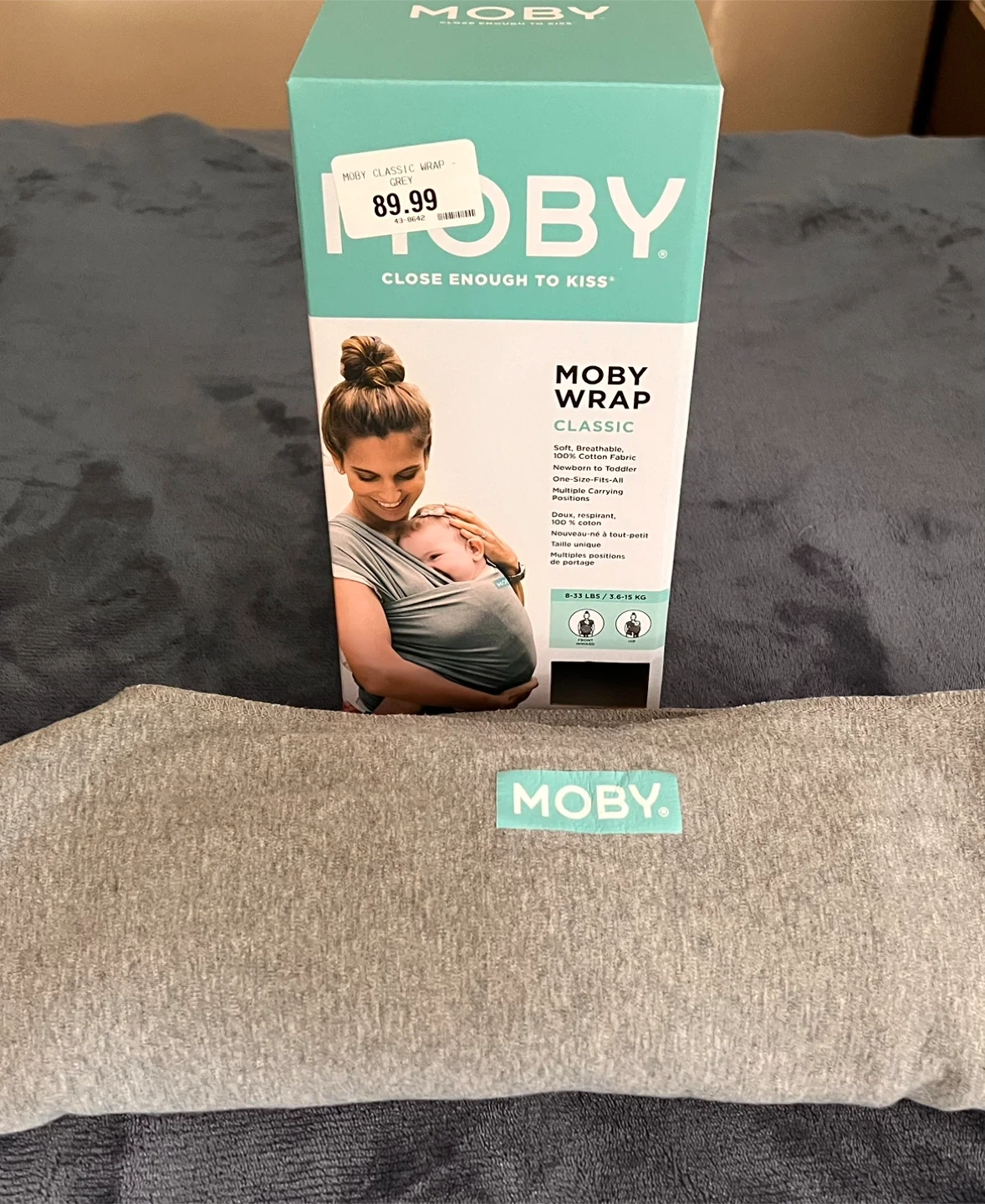 Selling a Moby Classic Wrap in grey! It's soft, breathable, and made from 100% cotton fabric. This wrap is one-size-fits-all and suitable for newborns to toddlers, supporting multiple carrying positions. The box says it's good for 8-33 lbs / 3.6-15 kg.