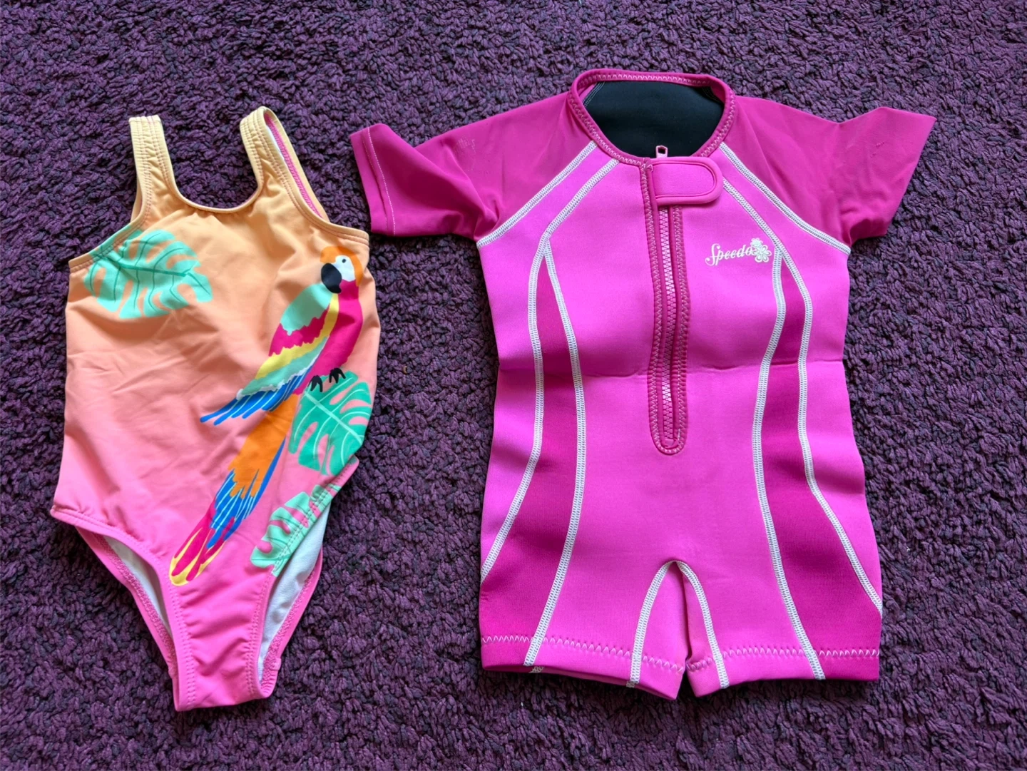 Two cute swimsuits for your little one! One is a colourful swimsuit with a parrot print 6-12months, and the other is a pink Speedo (fits 1 year) swimsuit. Both are in great shape and ready for some fun in the sun