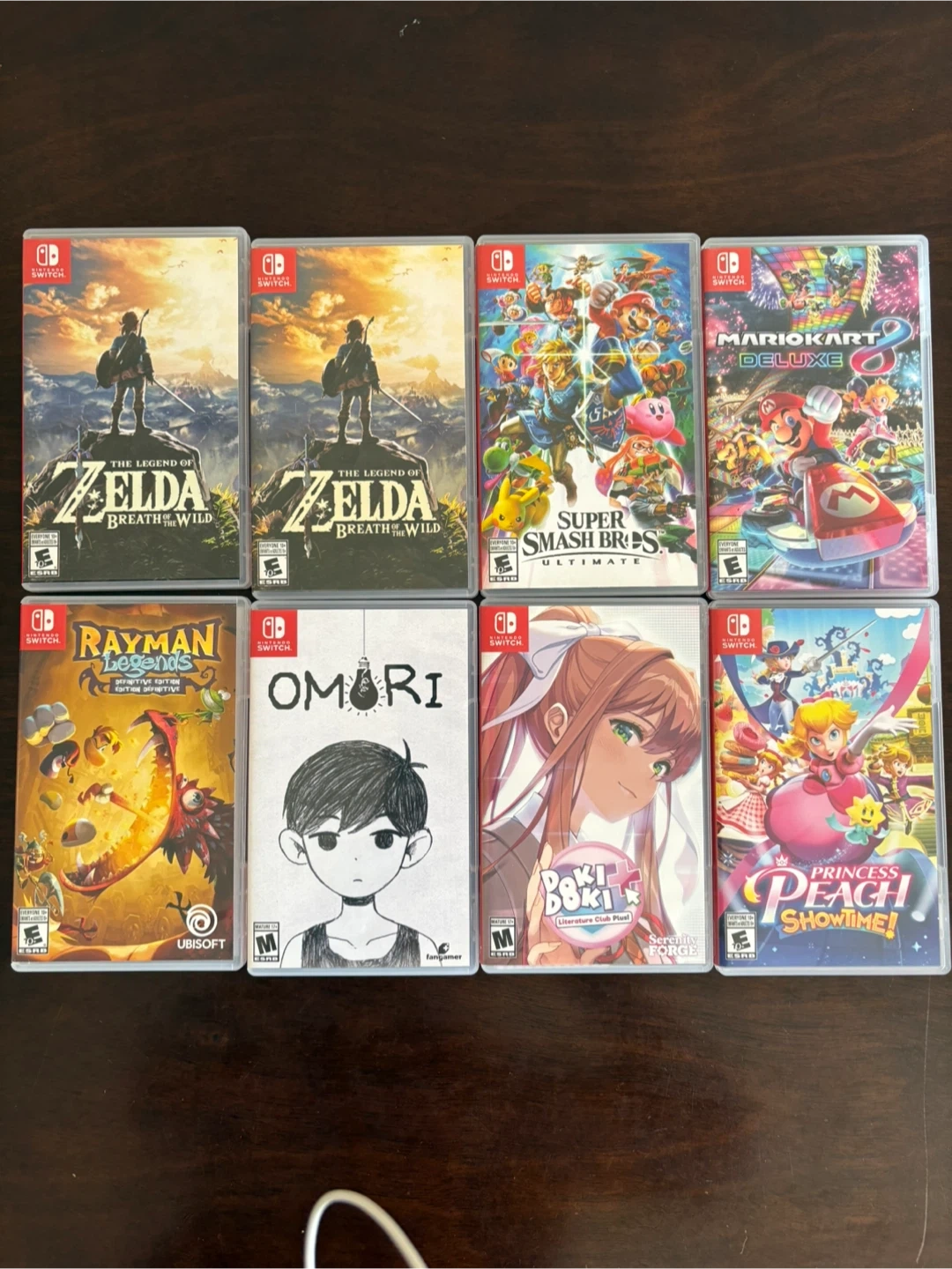 56Selling a collection of Nintendo Switch games! Titles include: - The Legend of Zelda: Breath of the Wild (x2) - Super Smash Bros Ultimate - Mario Kart 8 Deluxe - Rayman Legends Definitive Edition - Omori - Doki Doki Literature Club Plus - Princess Peach Showtime!