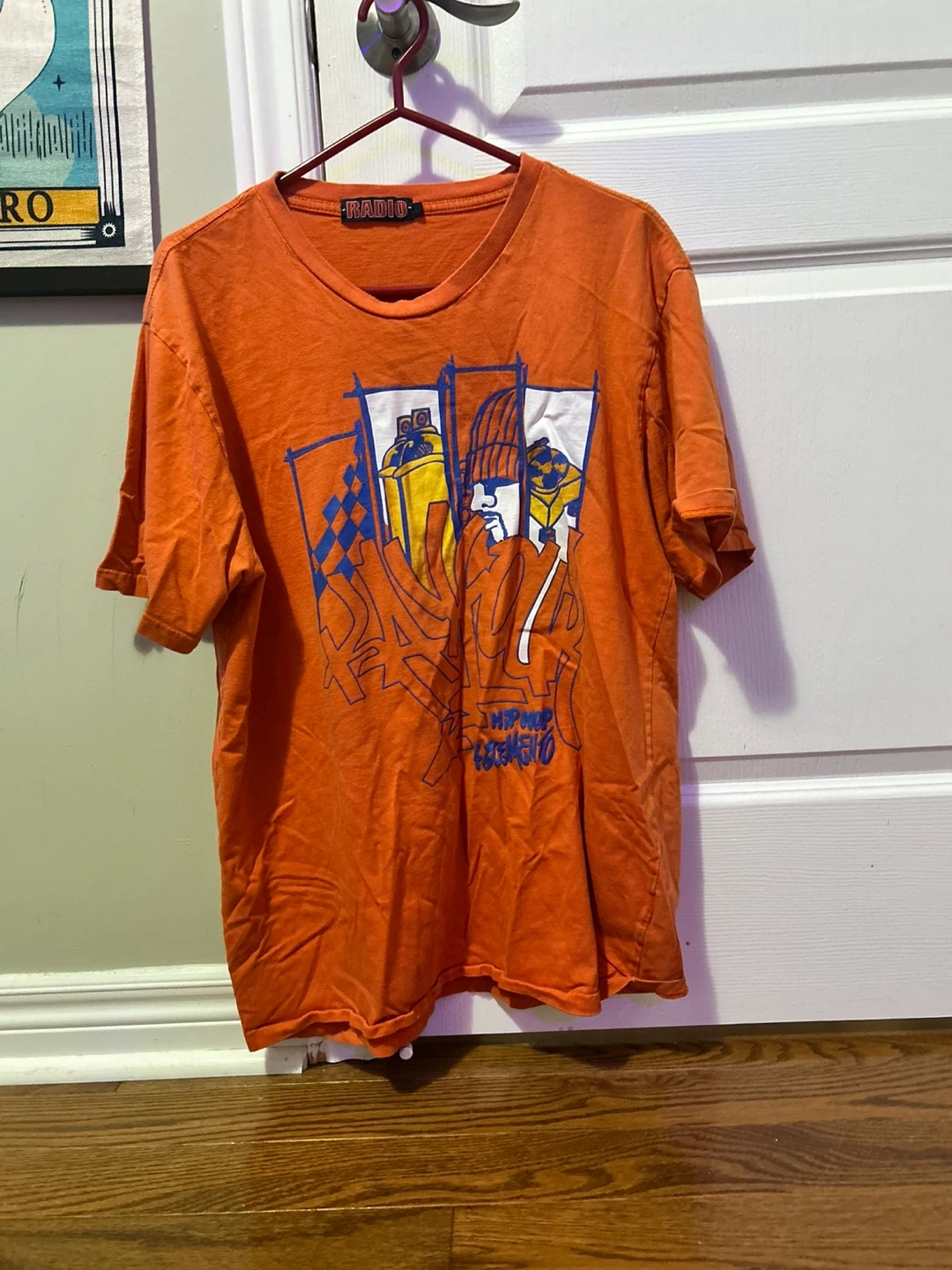 Selling a vintage gently used orange t-shirt from Radio! It features a cool graphic design on the front. Perfect for casual wear!
