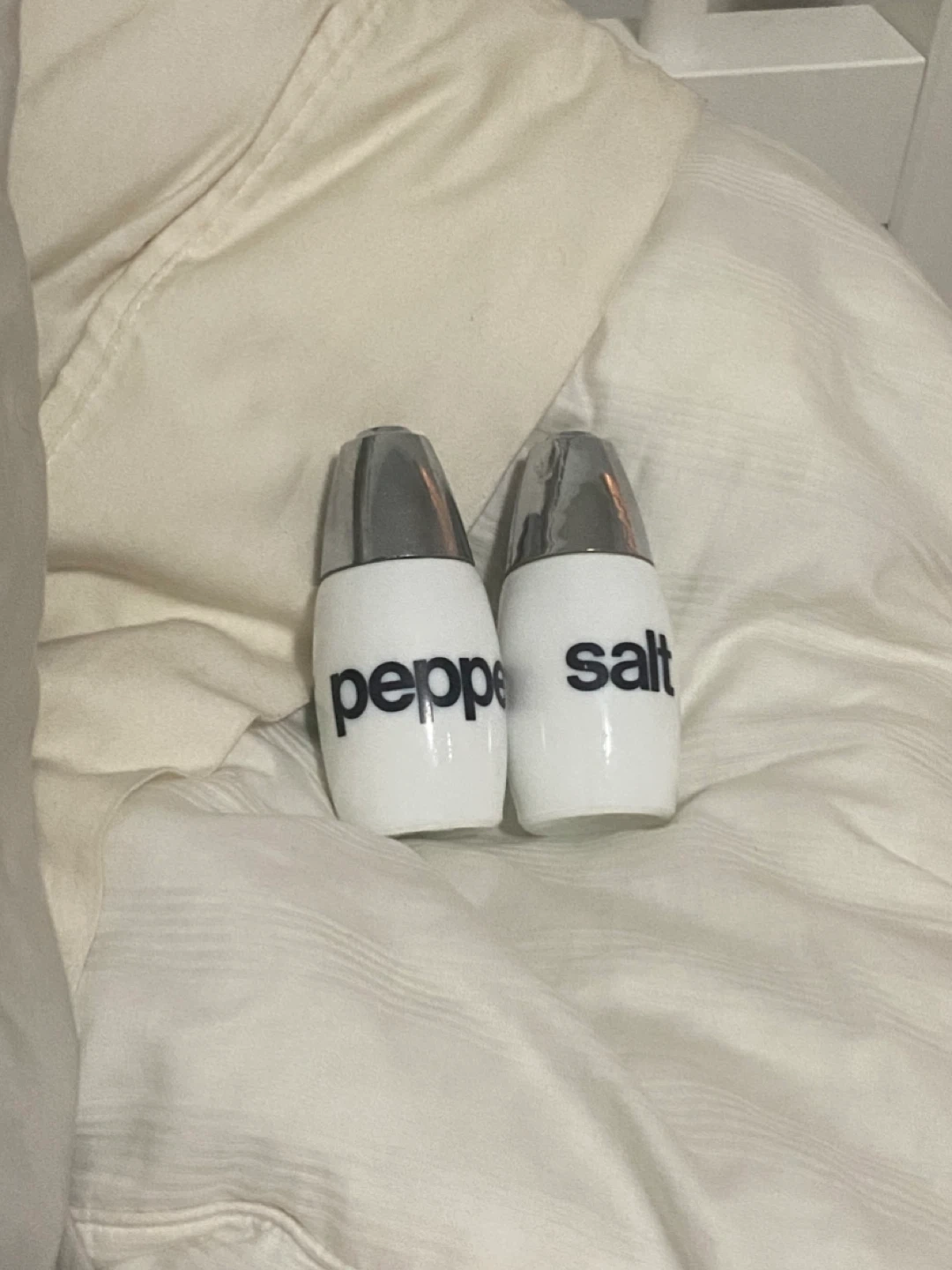 Here are a pair of salt and pepper shakers! They are white with a silver top, and the words 'pepper' and 'salt' are written on them in black