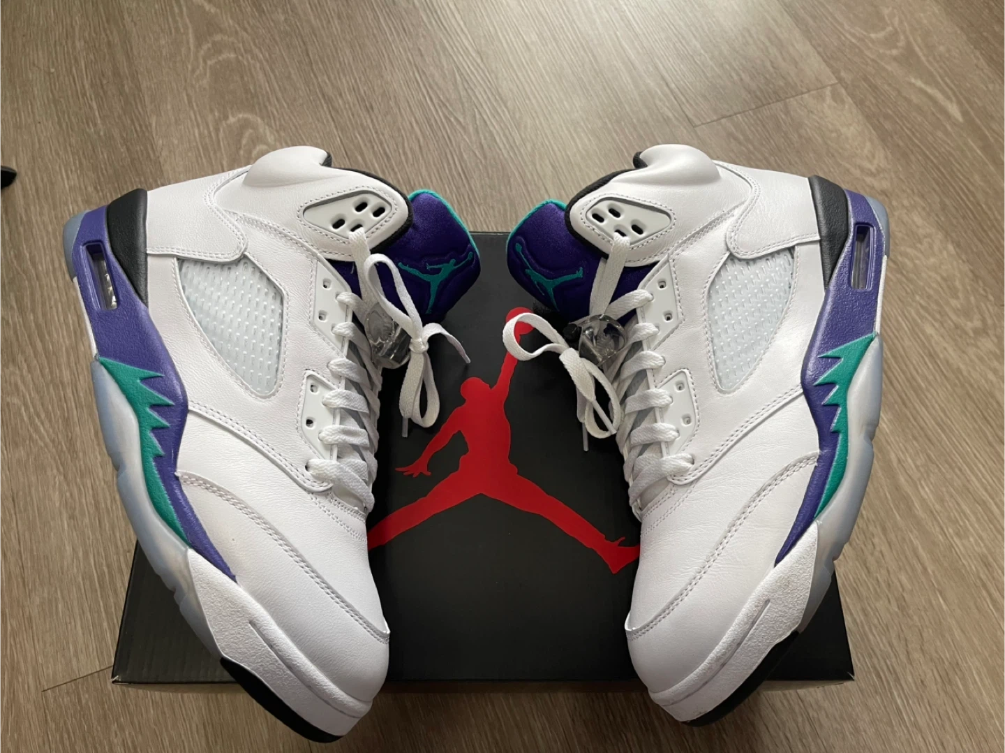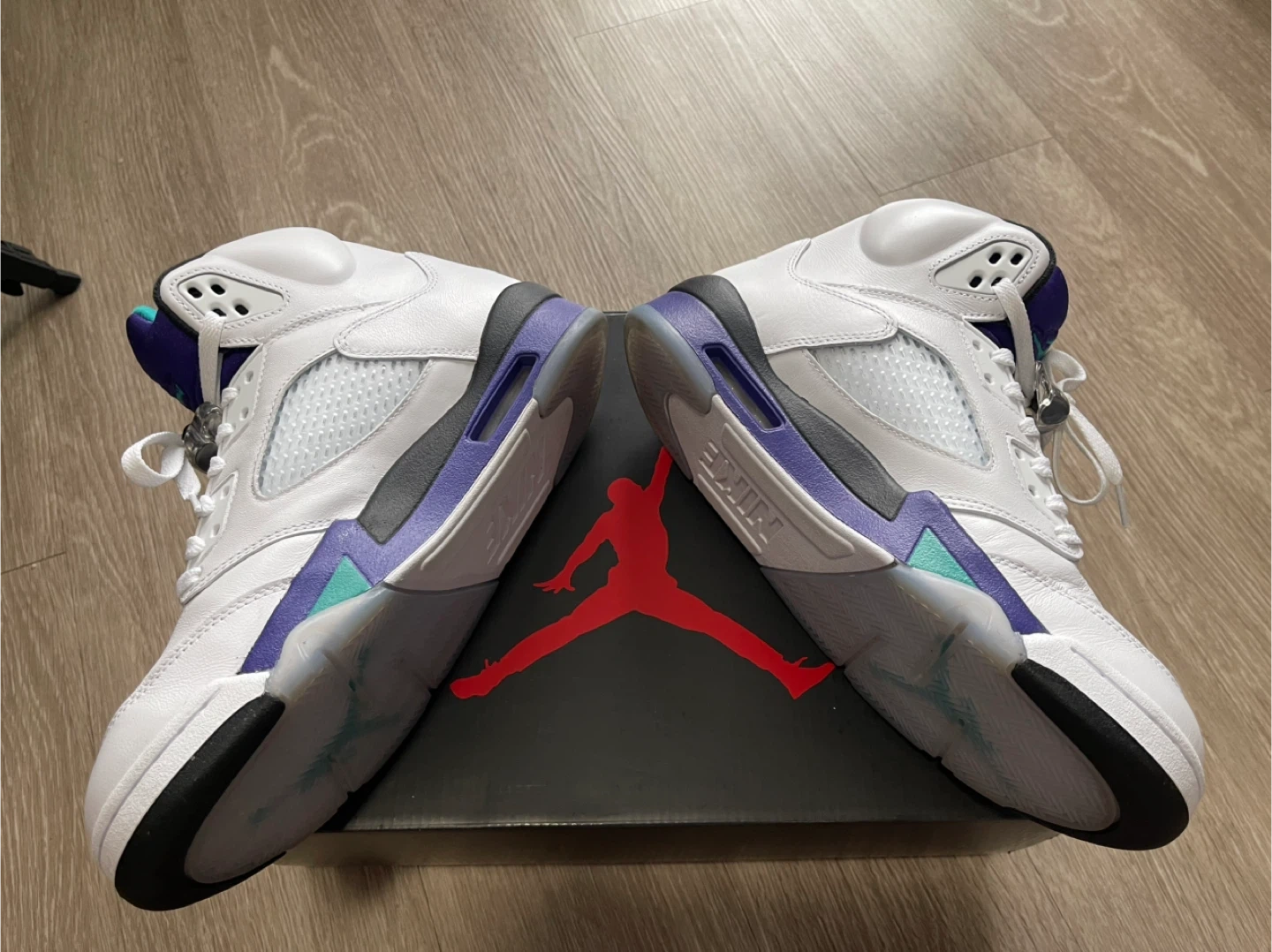 Classic Air Jordan 5 sneakers in the "Grape" colourway. Features white leather uppers with purple and teal accents. Includes original box. These kicks are ready for your collection!