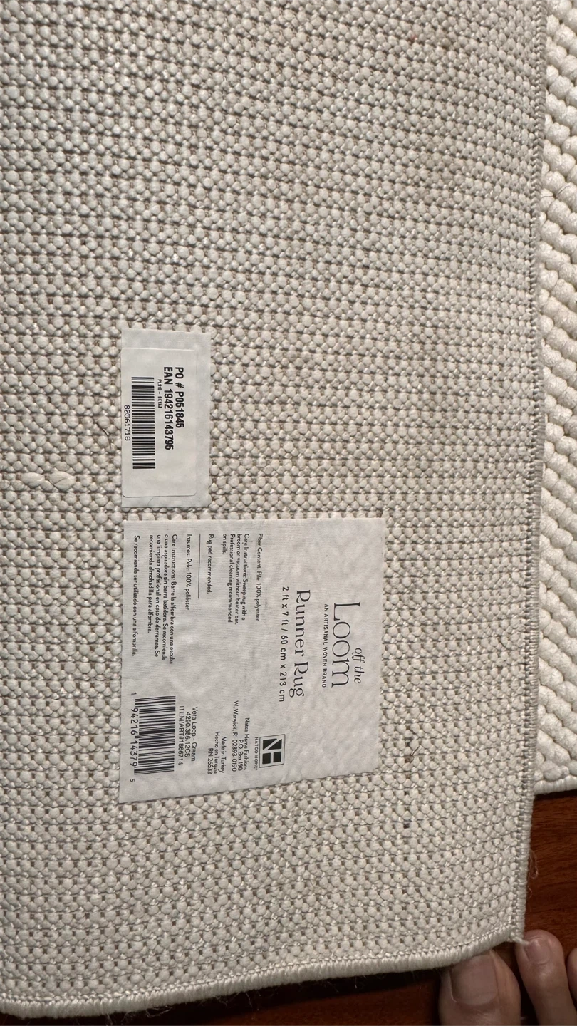 Selling a runner rug in cream colour. It's in great condition and ready to add a touch of warmth to your home! The size is 2 ft x 7 ft (61 cm x 213 cm). It's made of 100% polypropylene