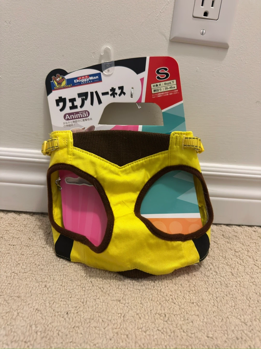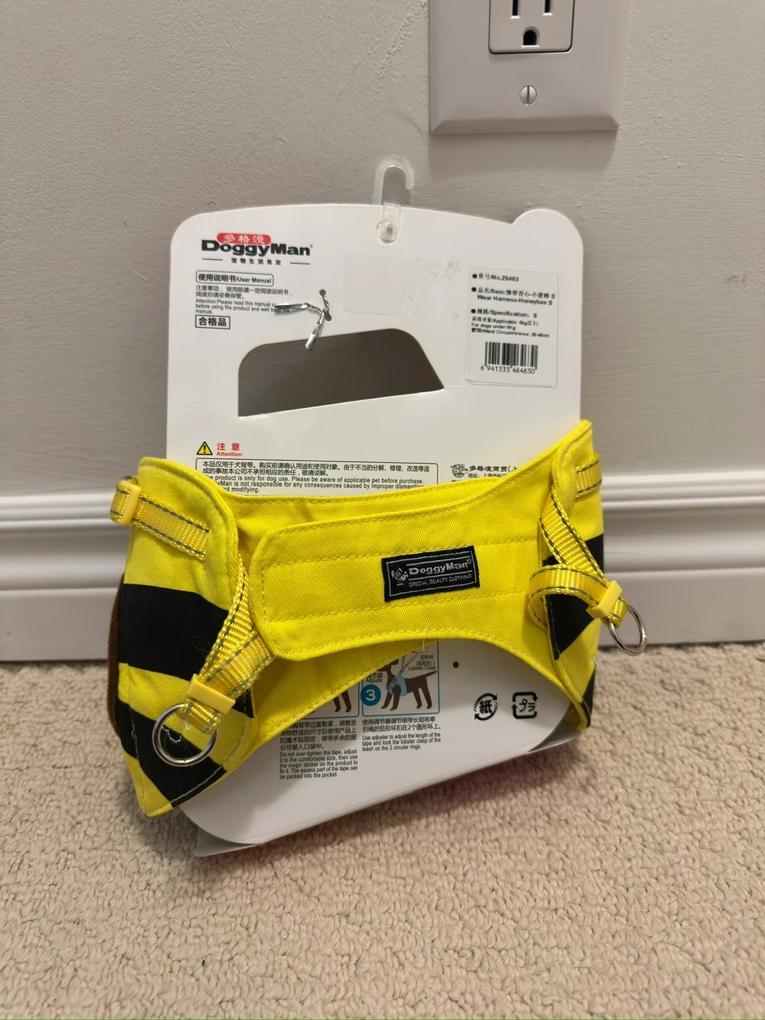 This is a DoggyMan pet harness in size S. It's yellow and black, perfect for a small dog! Recommended for dogs up to 8kg with a chest girth of 39-46cm. It's in great condition and ready for a new furry friend