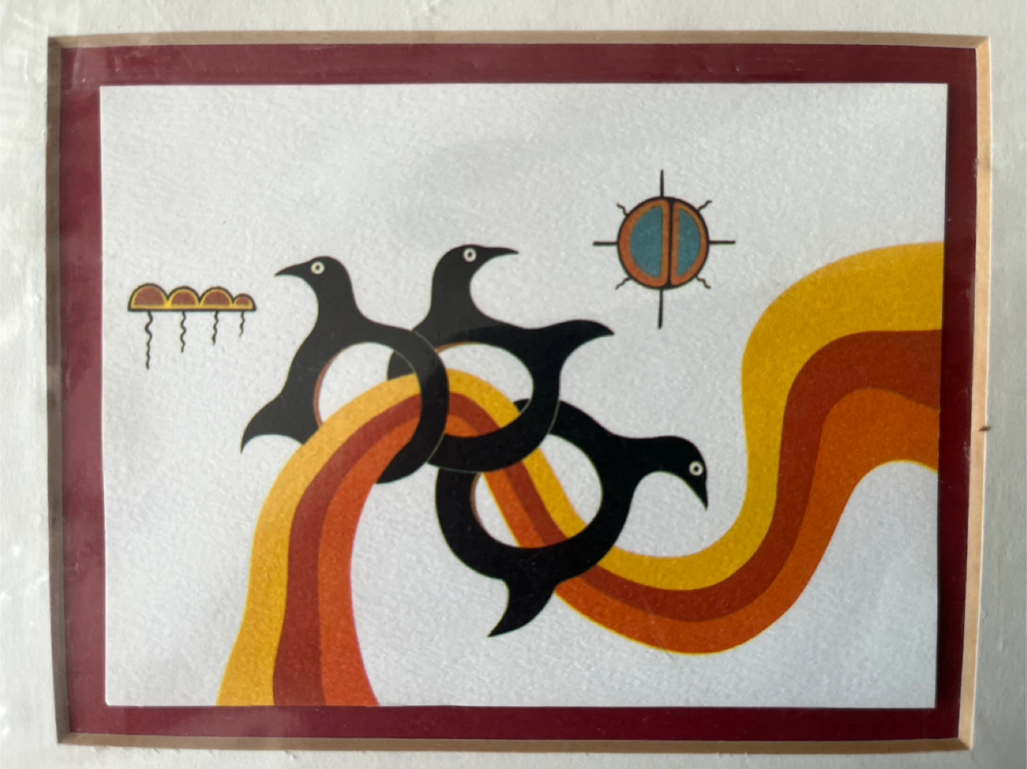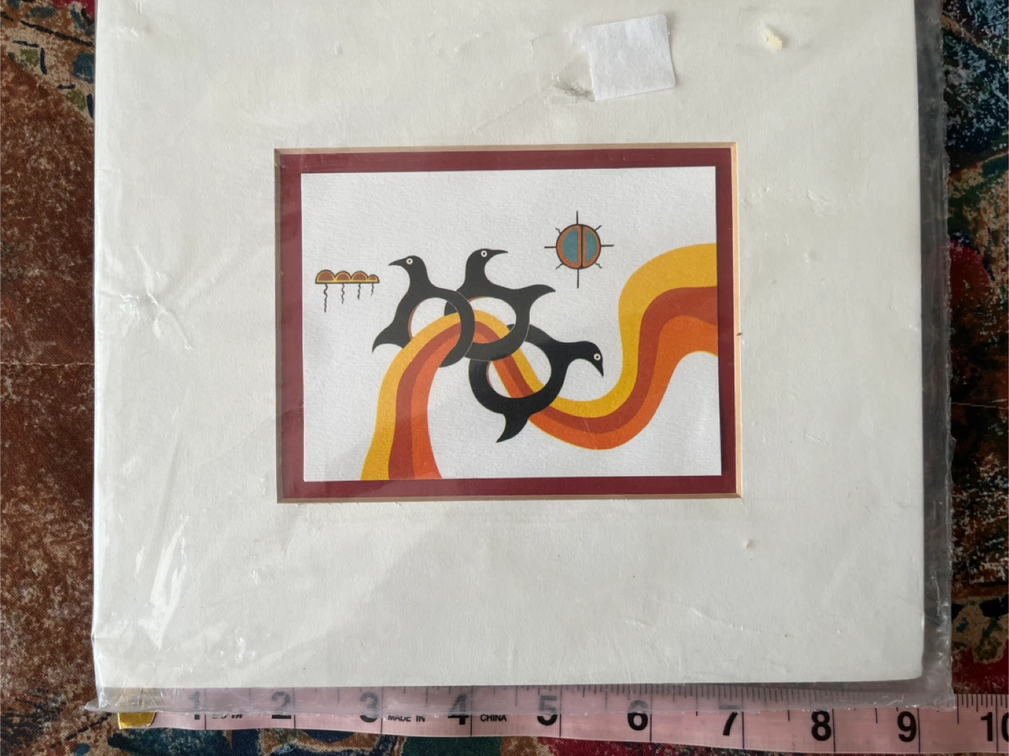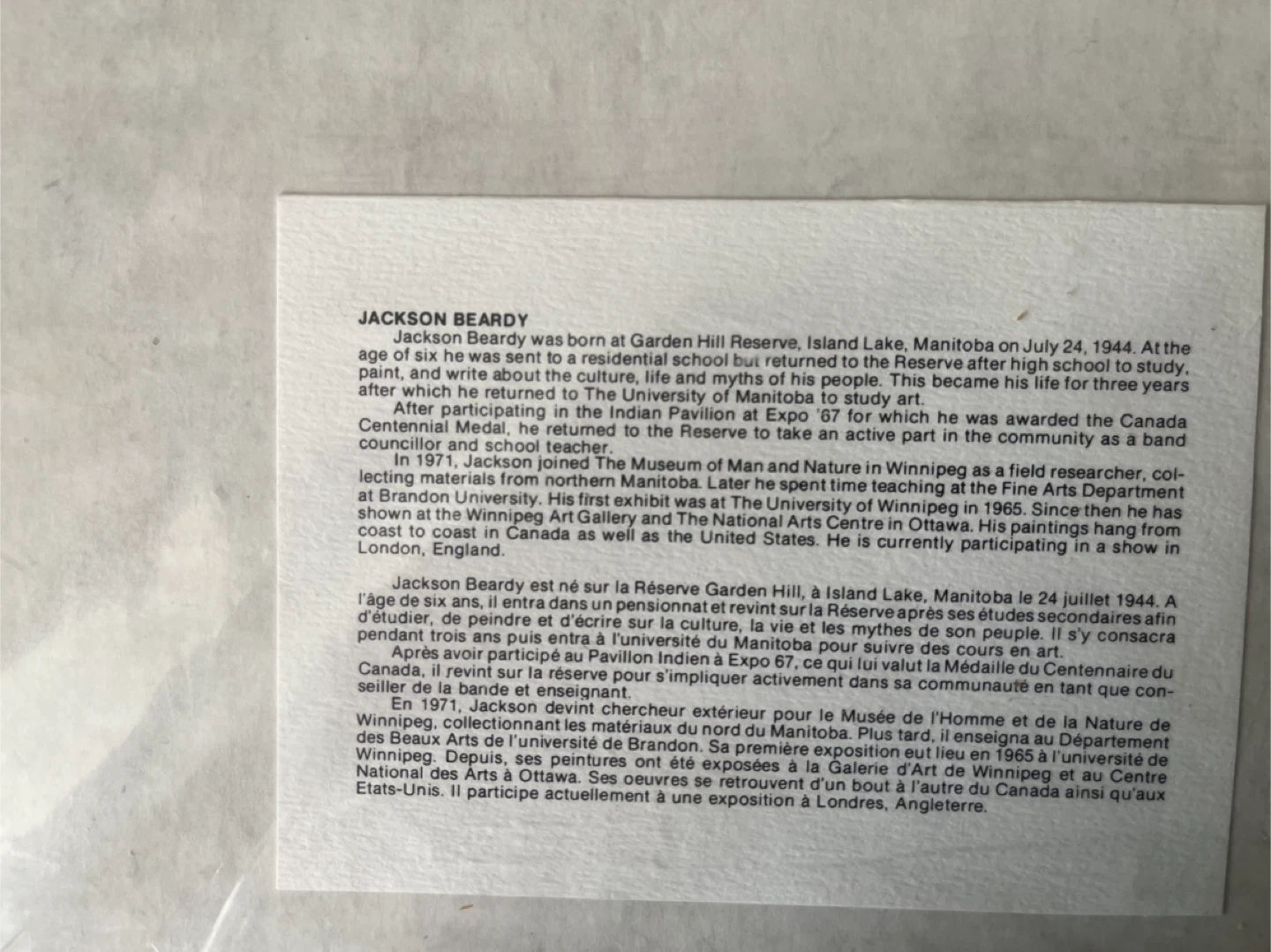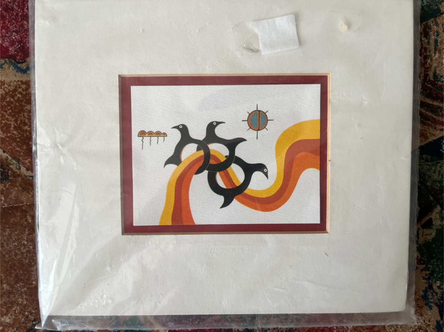 This is a print by the late Oji-Cree Anishinaabe artist Jackson Beardy (1944-1984). “His works are characterized by scenes from Ojibwe and Cree oral history and many focus on the relationship between humans and nature”, Wikipedia. He “was a prominent member of the Indian Group of Seven. His work has contributed to the recognition of indigenous contemporary art within Canada”. (Read more on Wikipedia, very interesting!)