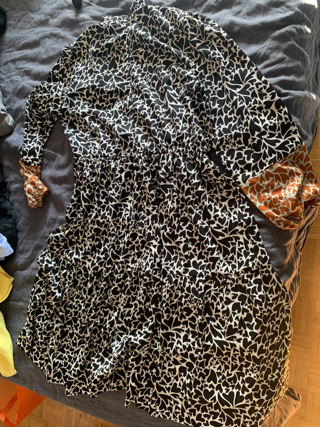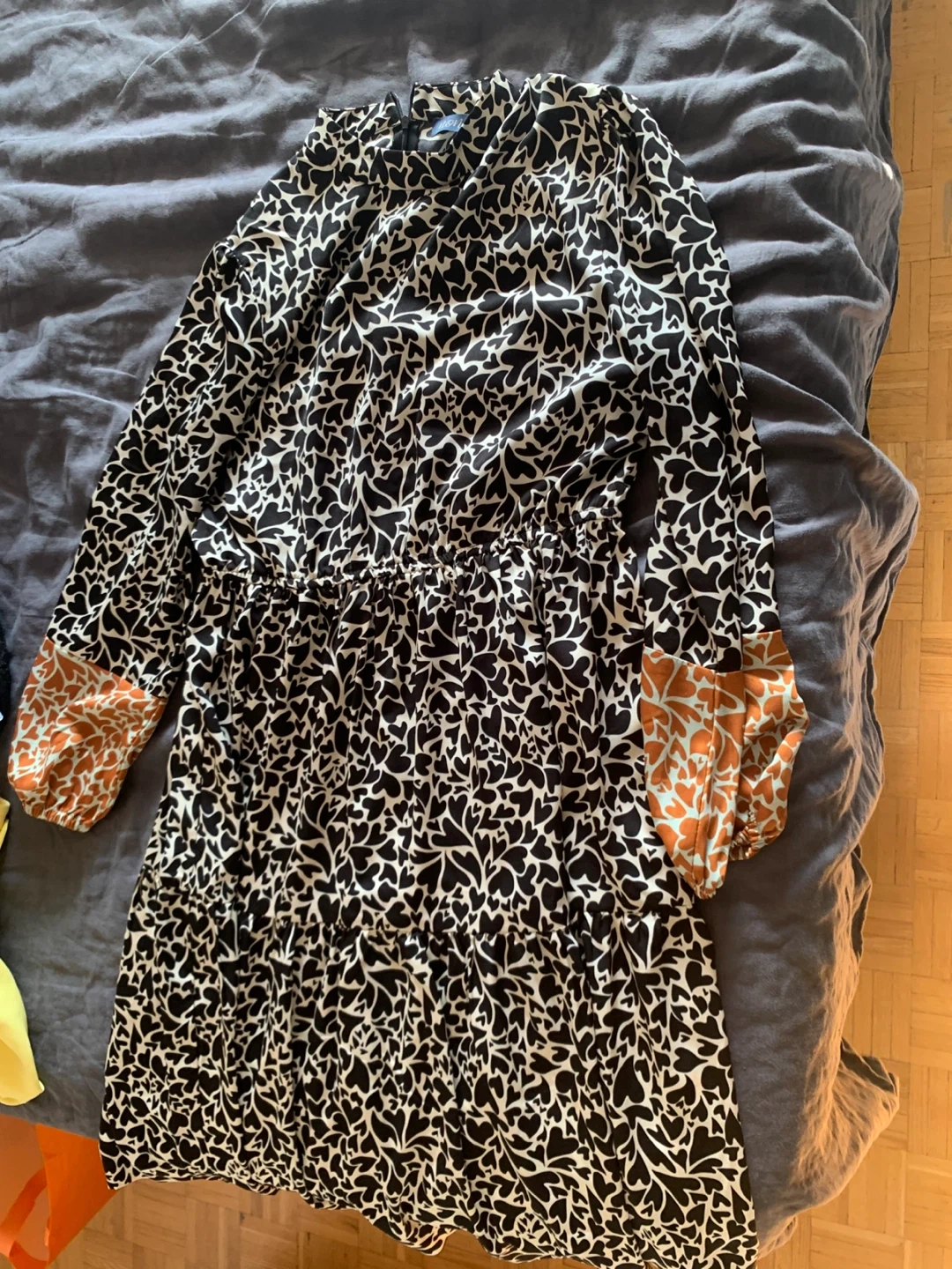 Check out this stylish Noni dress! It features a unique black and white pattern that's sure to turn heads. The dress has long sleeves and a comfortable fit, perfect for any occasion. Made in China
