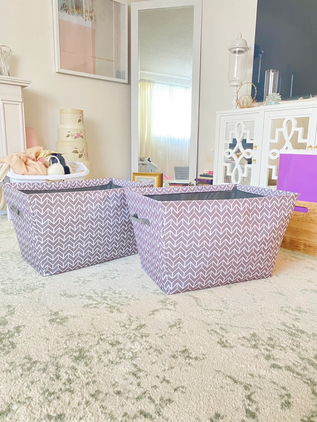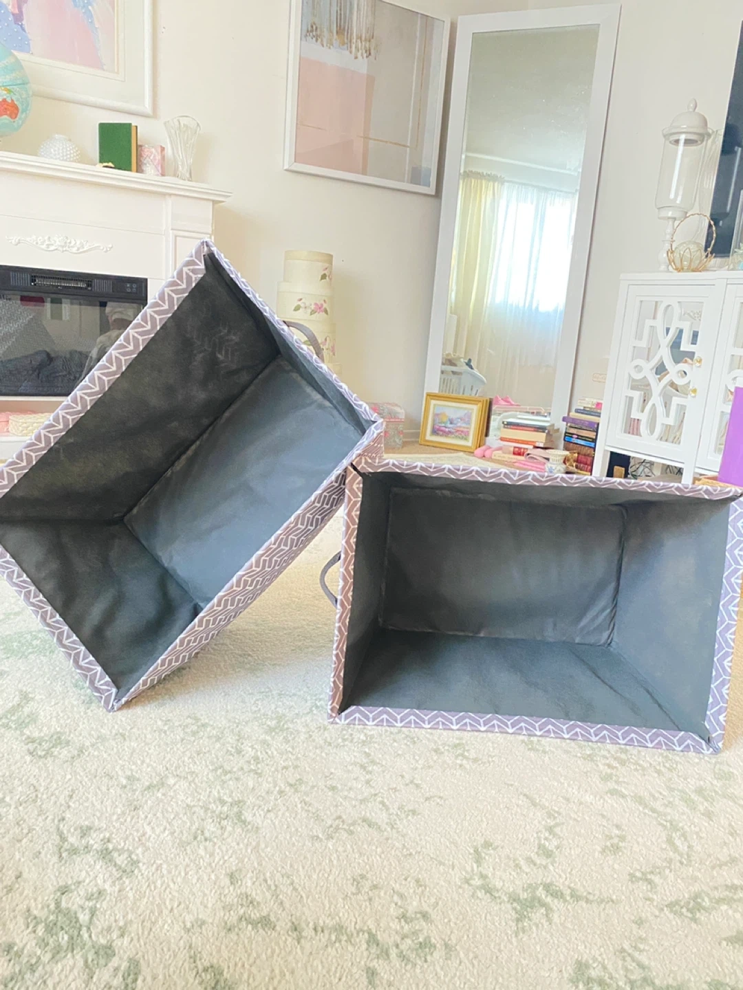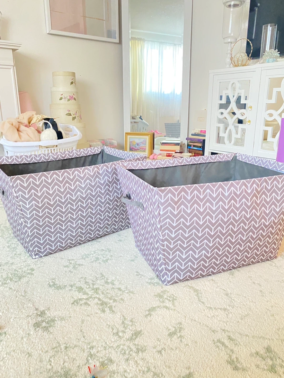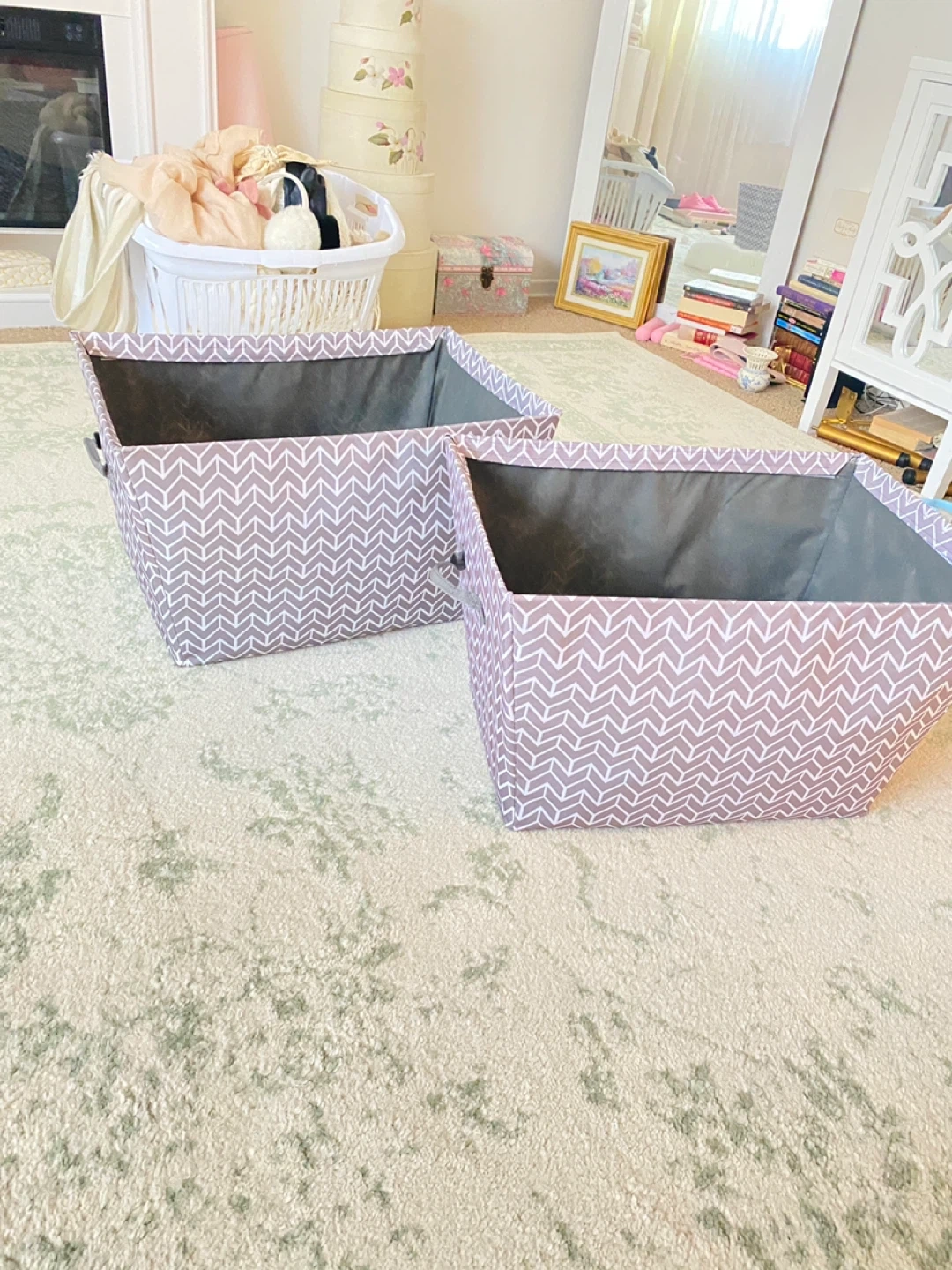 Selling a pair of storage bins! They have a cute grey and white chevron pattern on the outside and a solid grey lining. Perfect for organizing toys, clothes, or anything else you need to store away neatly. Perfect condition like new