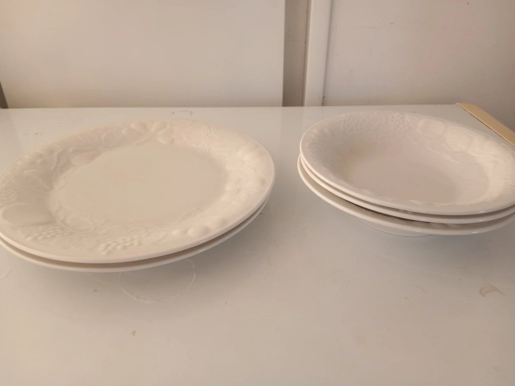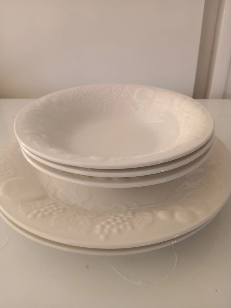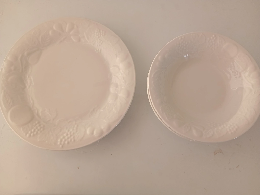 277Selling a set of dinner plates and bowls with a lovely embossed fruit and floral design. These are perfect for everyday use or special occasions, adding a touch of elegance to your table setting. They're in great condition and ready for a new home!