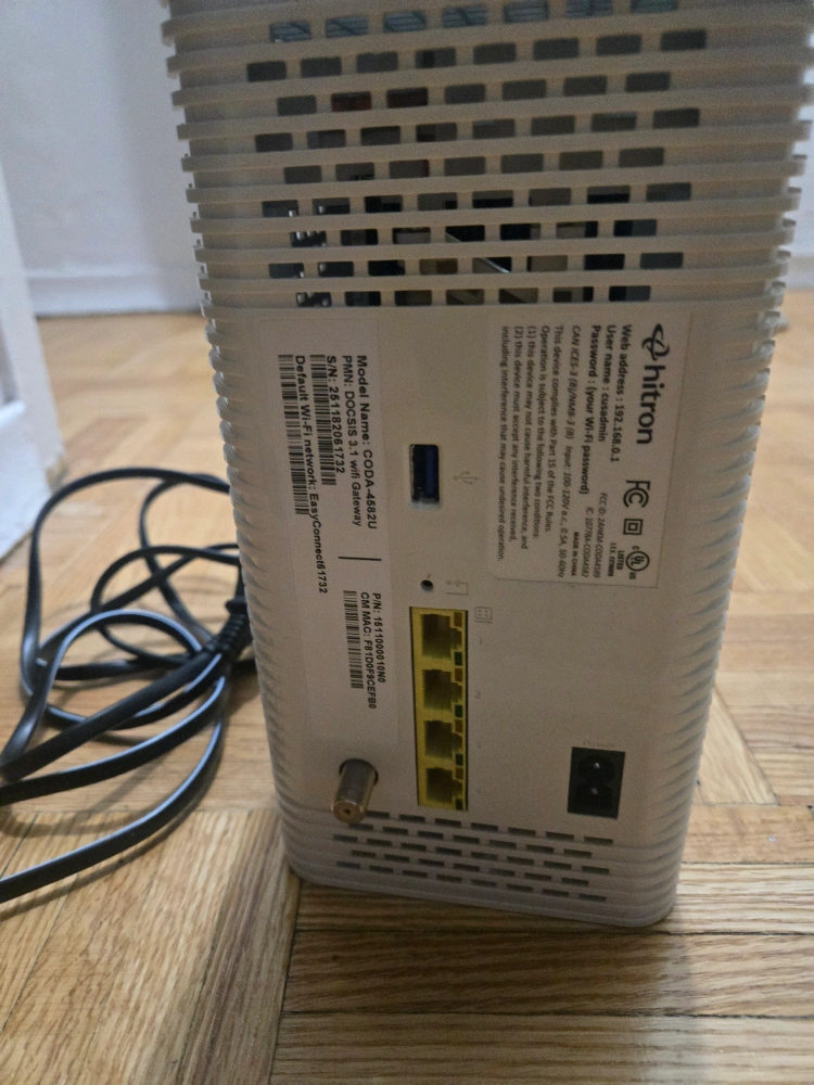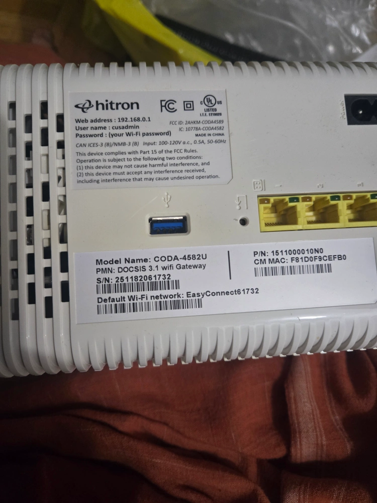 Selling a Hitron CODA-4582U DOCSIS 3.1 WiFi Gateway. It's in great condition and ready for a new home! This gateway is perfect for anyone looking to upgrade their internet setup. It provides a reliable and fast connection for all your devices