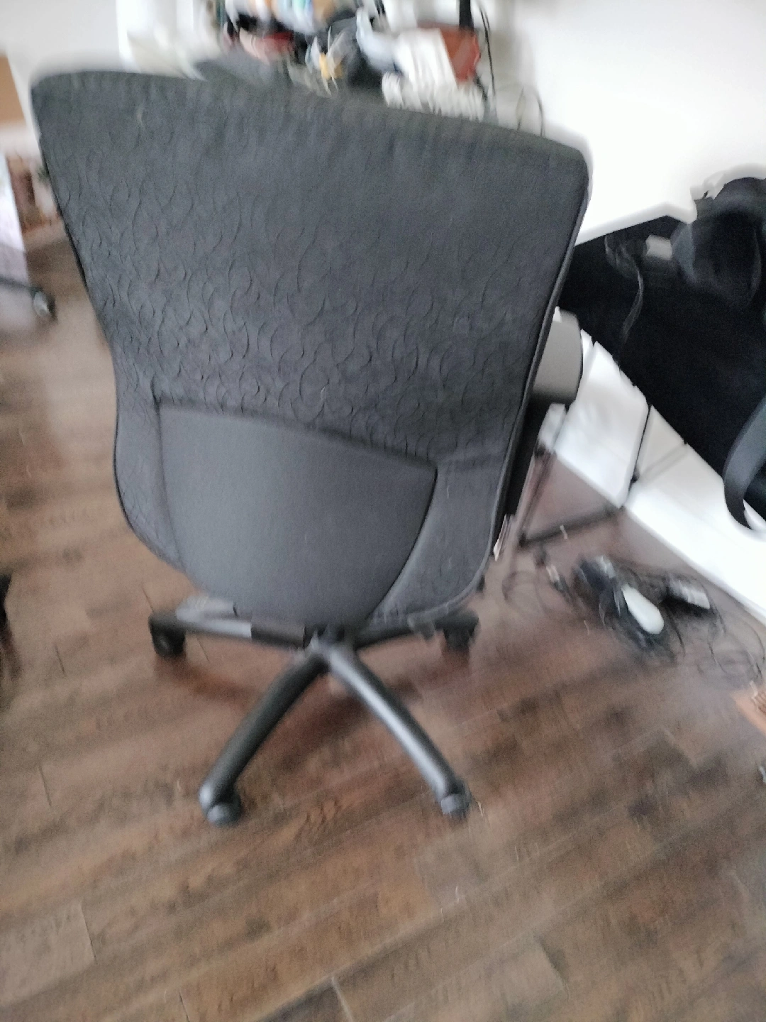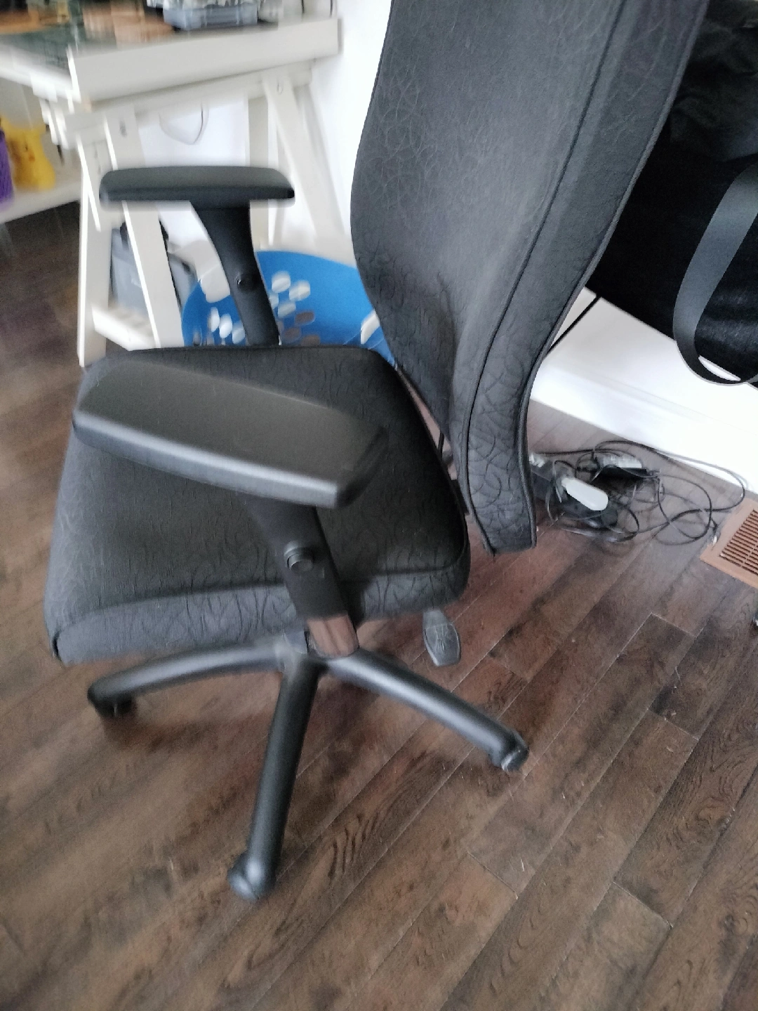 Office chair with a black patterned fabric. It has adjustable arm rests and a five-star base with wheels. Good condition.