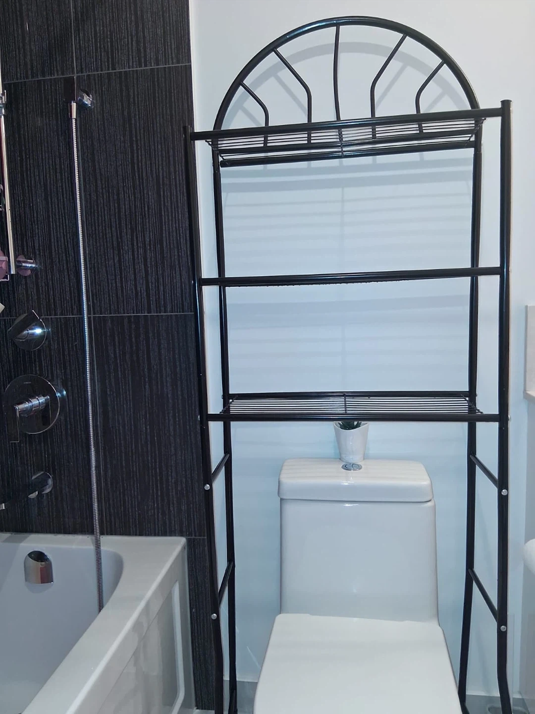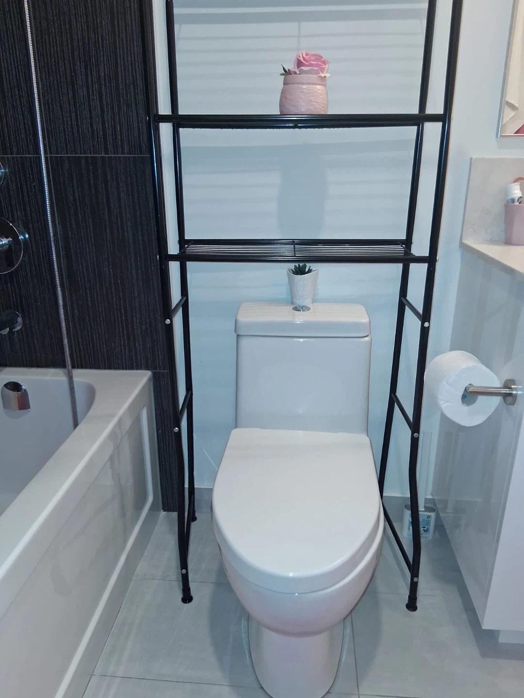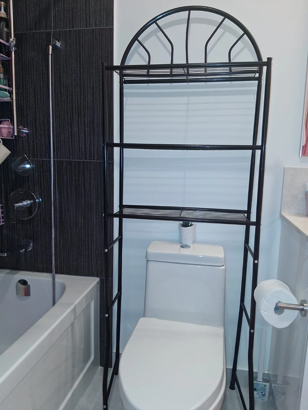 345Declutter your bathroom with this handy over-the-toilet space saver shelf! It's a great way to add extra storage without taking up too much floor space. Perfect for small bathrooms or anyone looking to maximize their storage