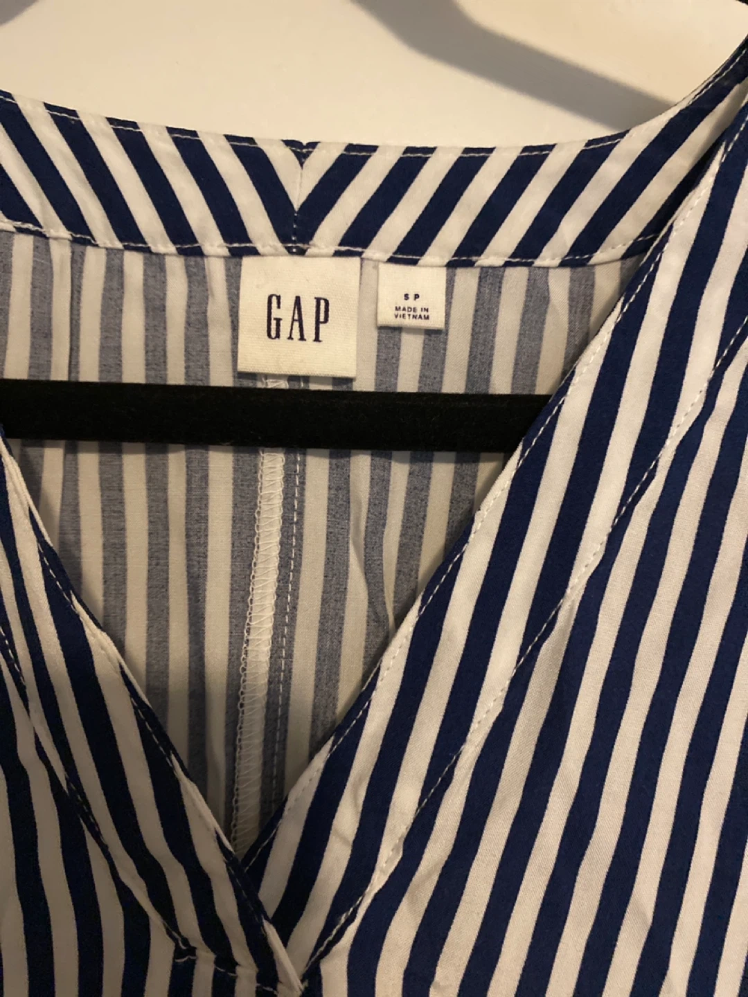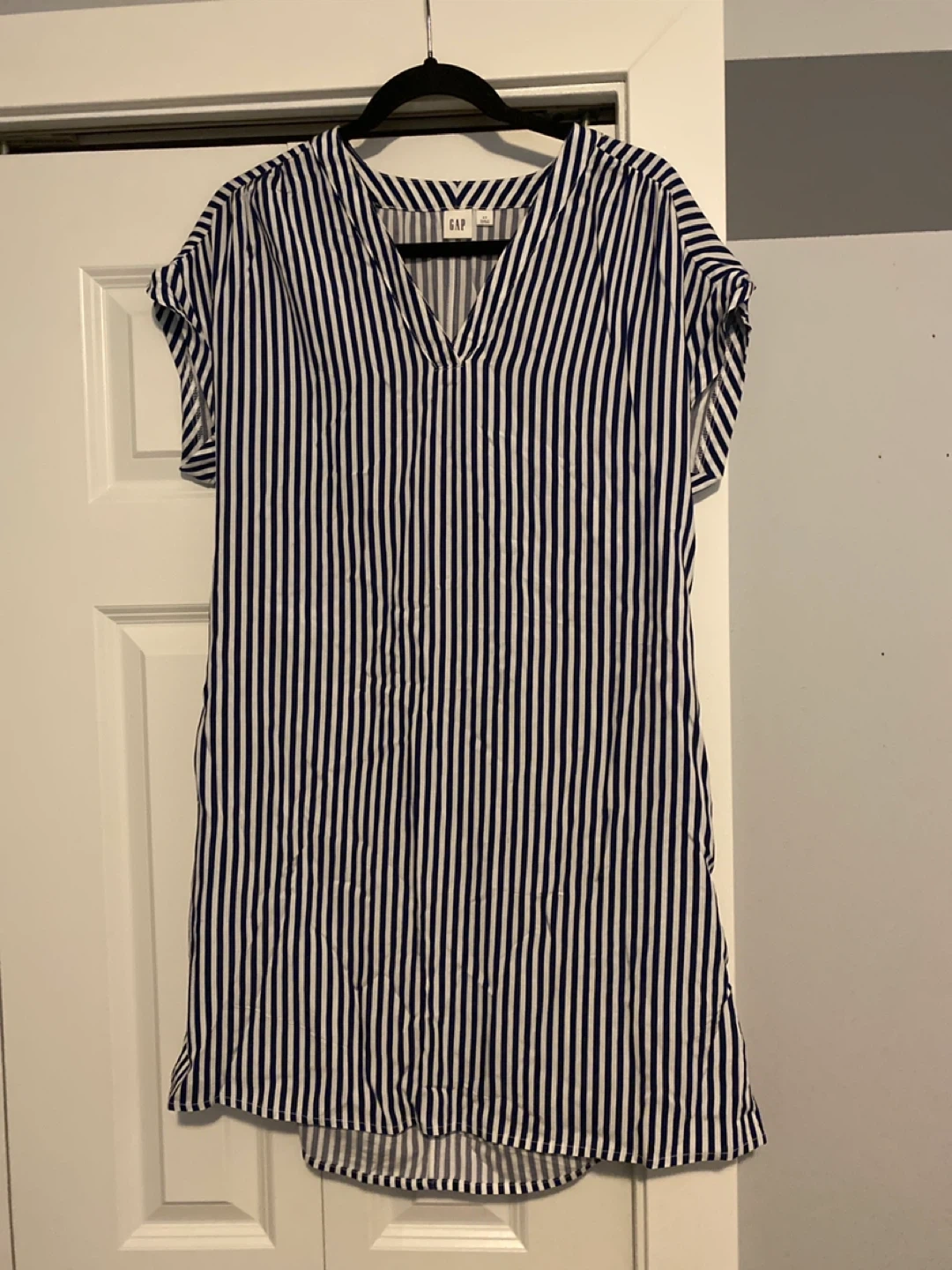 I'm selling a Gap dress with a navy and white striped pattern! It's a size SP (small petite). I love this dress and am only selling because it doesn’t fit.