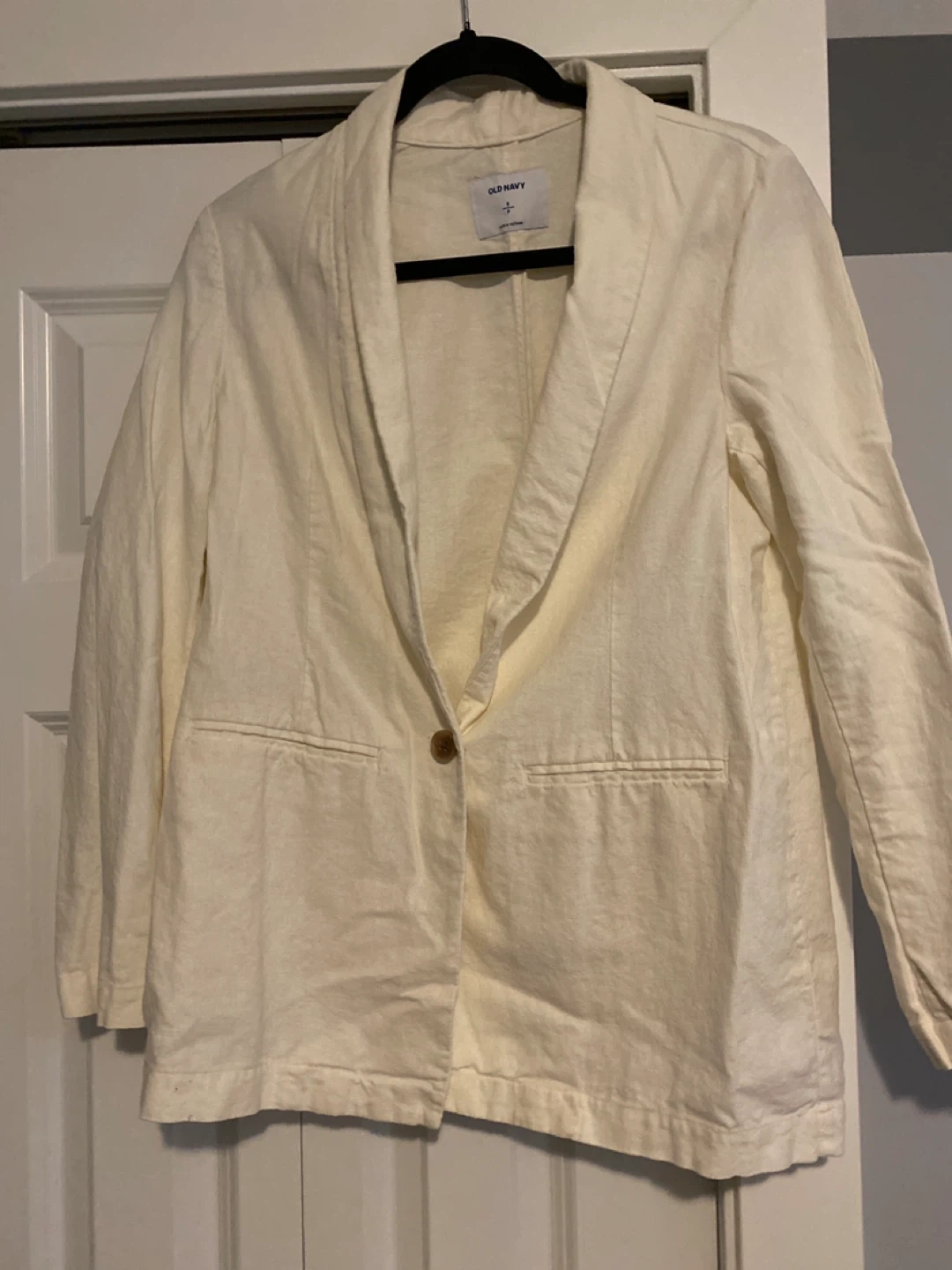 Selling a cute cream-coloured linen blazer from Old Navy! It's a size small and in great condition. Perfect for layering or dressing up an outfit. The material is lightweight and comfortable for all-day wear