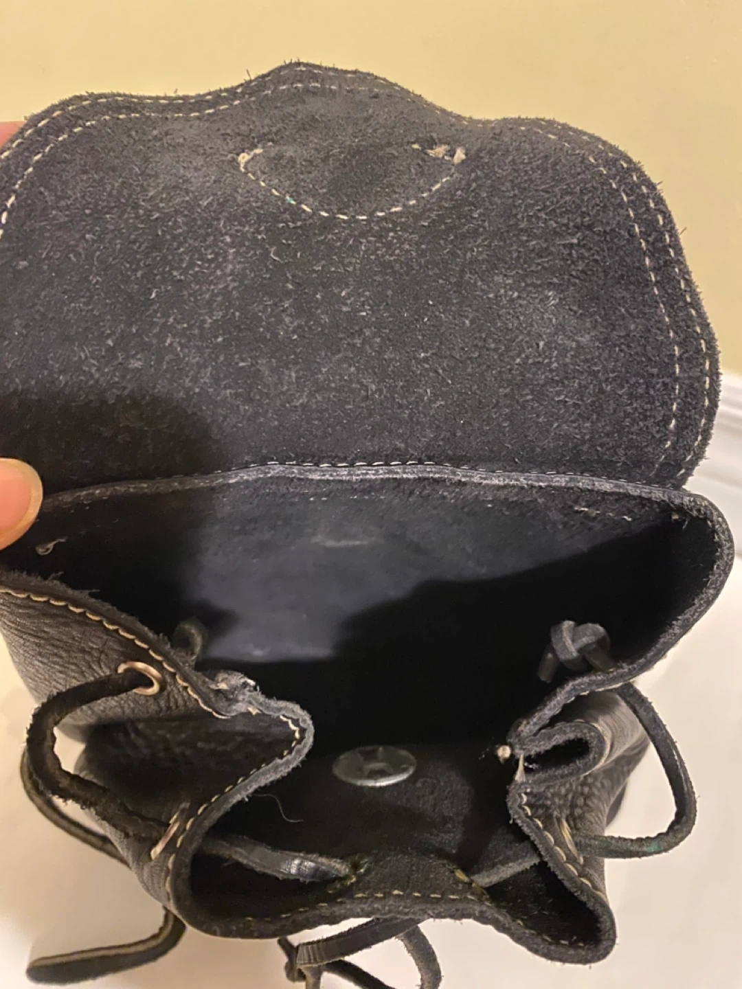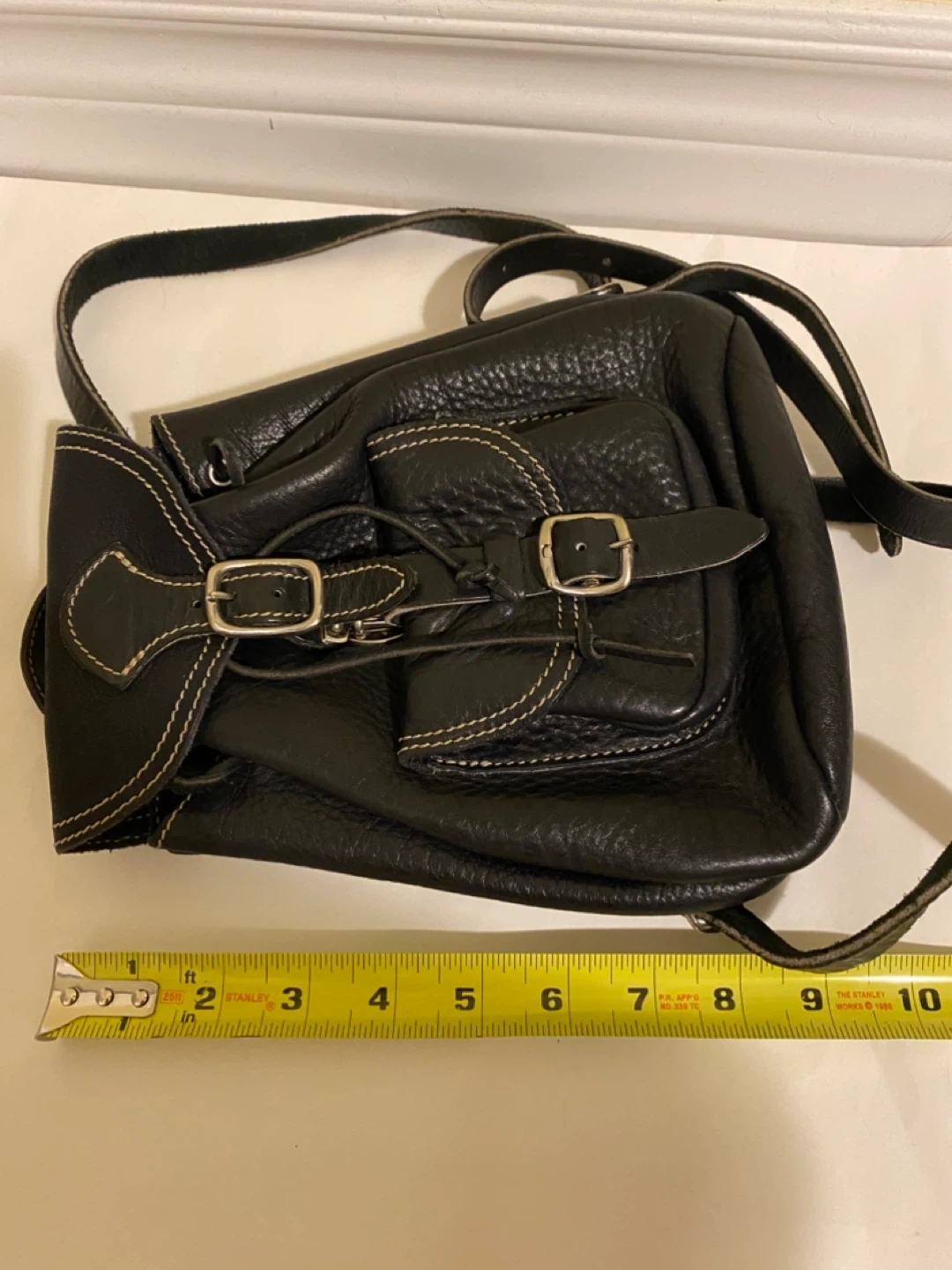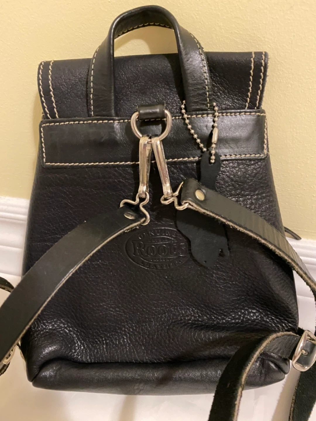 118Cute Roots mini backpack in black leather! It has a unique style with buckle details and a compact size. Perfect for carrying essentials while keeping your hands free