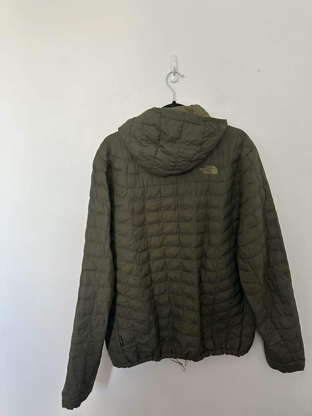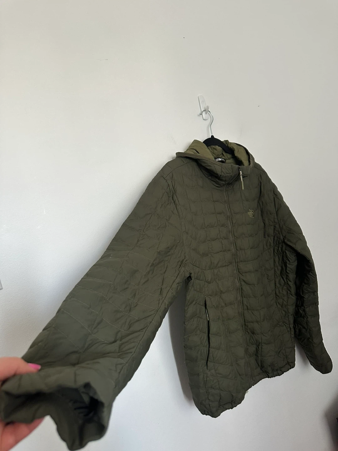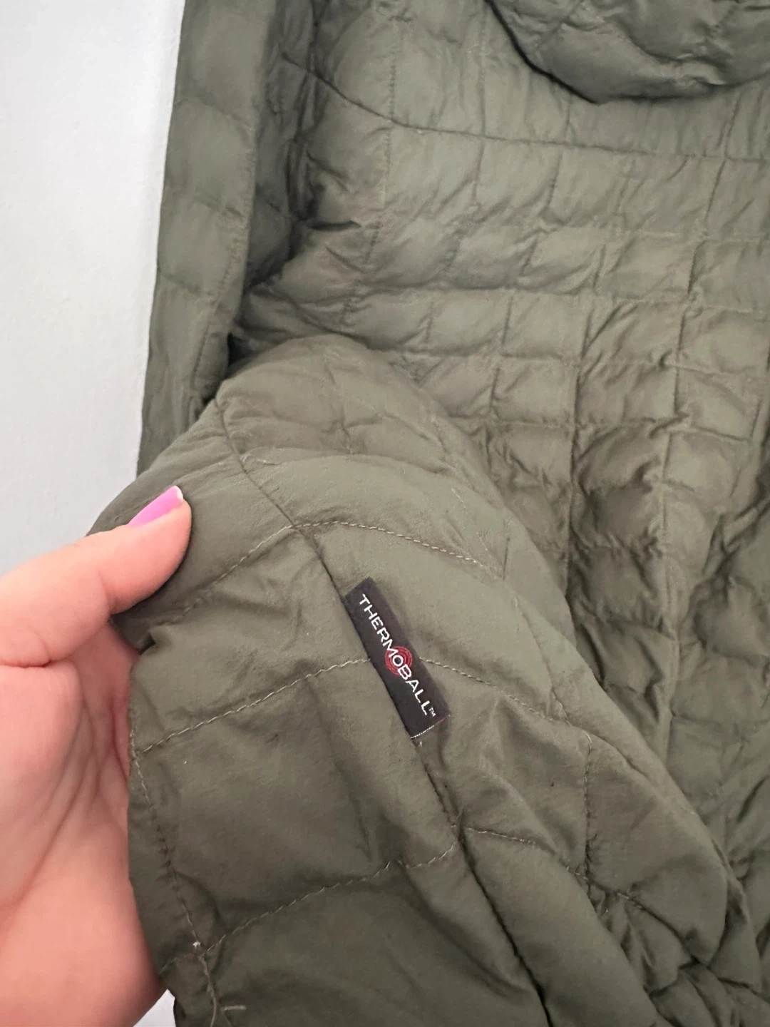 Selling a The North Face Thermoball jacket in a nice green colour. It's in great shape and ready for a new home! Perfect for layering or wearing on its own during those milder days. It's lightweight and packs down easily, making it great for travel or hiking. Lightweight and warm. Ideal for outdoor activities. The jacket has a drawstring bottom and a hidden pocket on the inside.