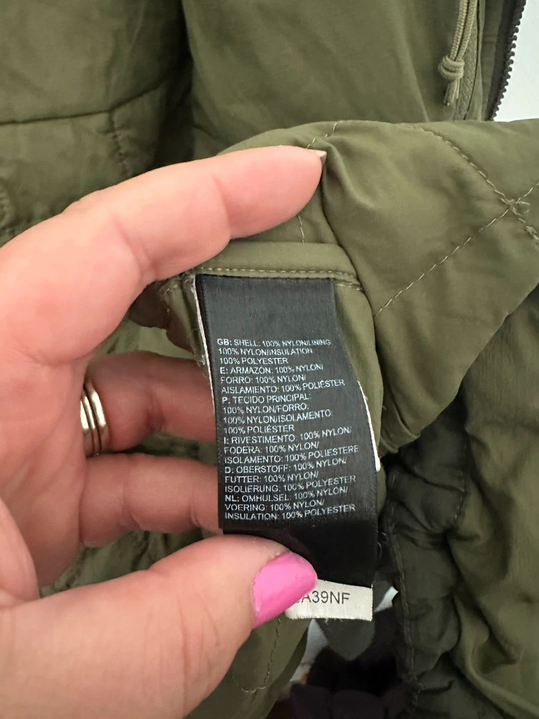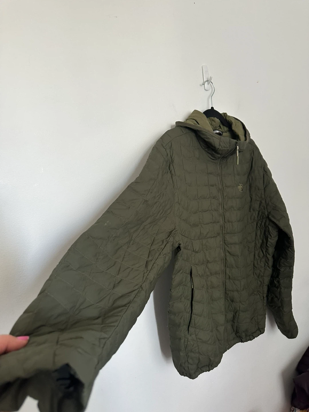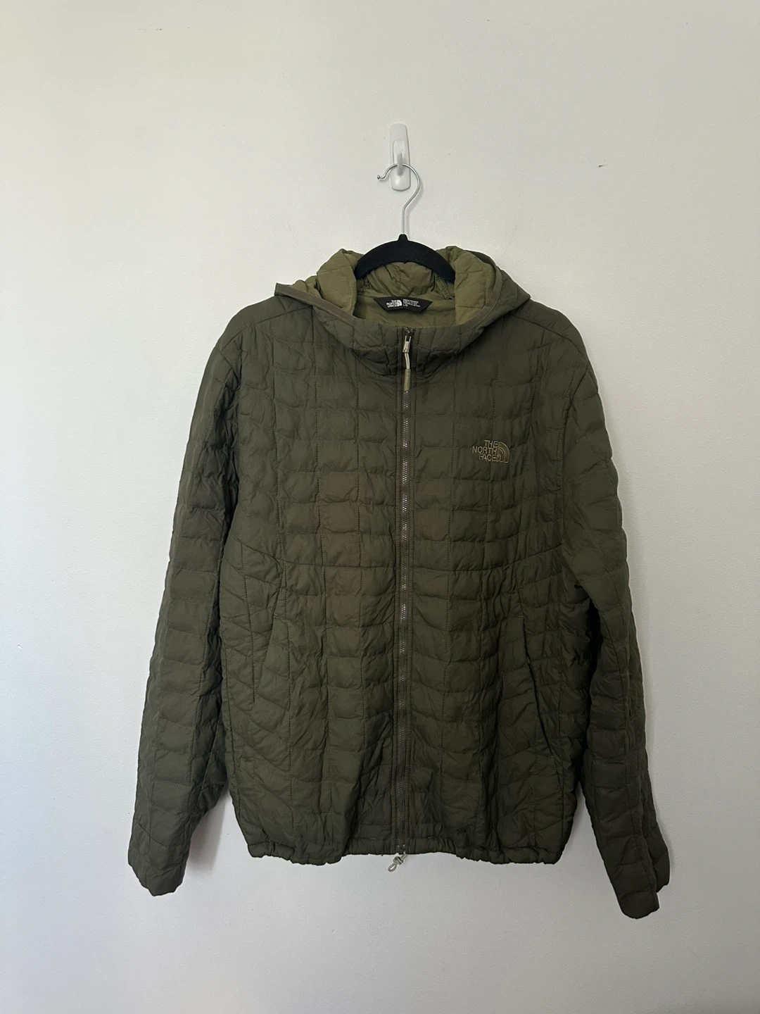 Selling a The North Face Thermoball jacket in a nice green colour. It's in great shape and ready for a new home! Perfect for layering or wearing on its own during those milder days. It's lightweight and packs down easily, making it great for travel or hiking. Lightweight and warm. Ideal for outdoor activities. The jacket has a drawstring bottom and a hidden pocket on the inside.